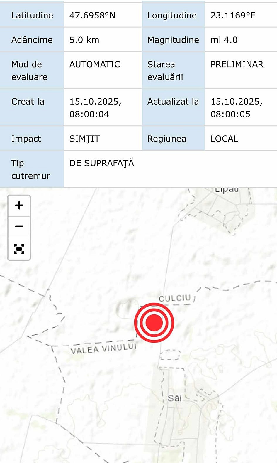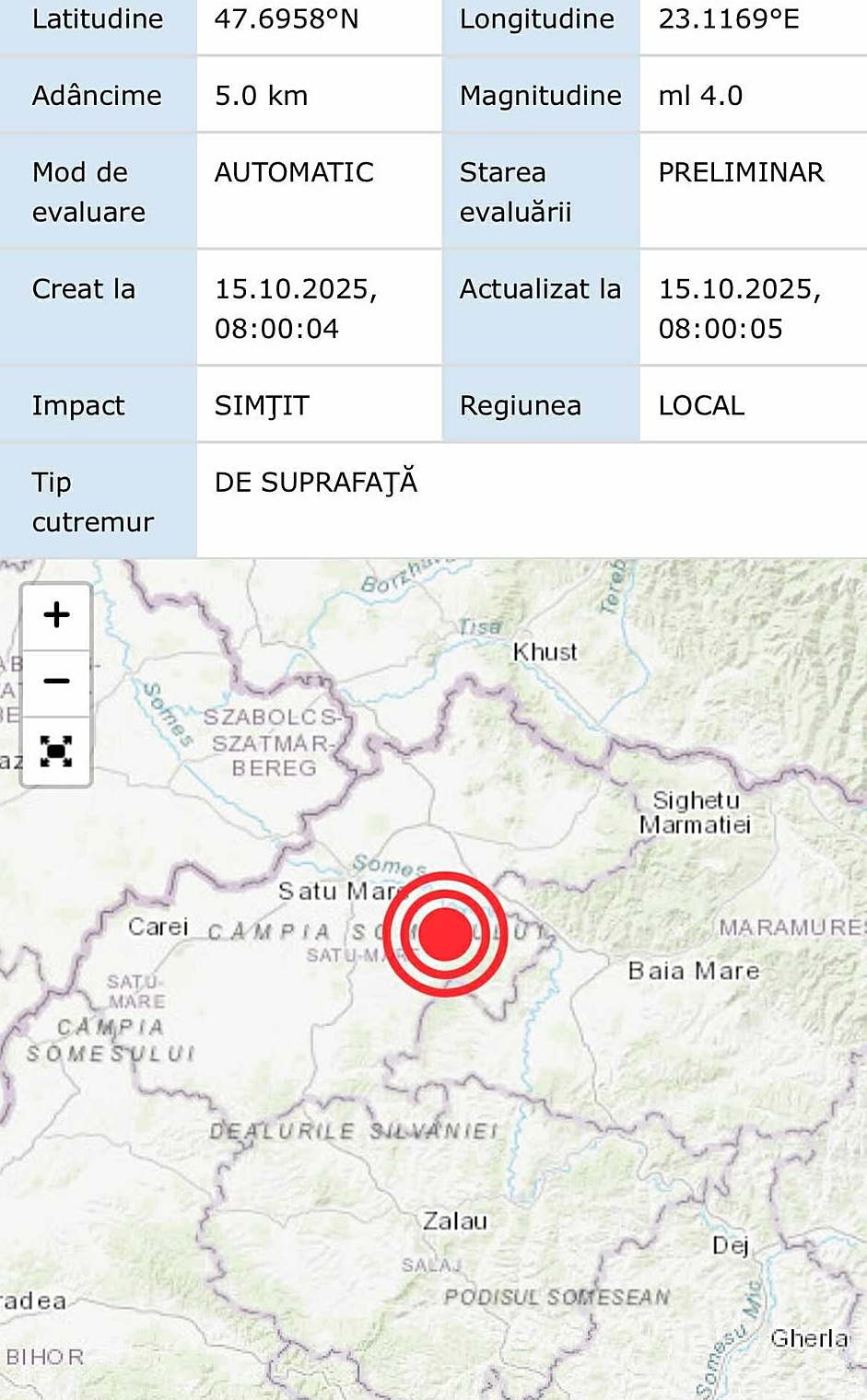 În dimineața zilei de 15 octombrie 2025, la ora 07:57:20, un cutremur cu magnitudinea 4,0 pe scara Richter s-a produs în zona Maramureș – Satu Mare, la o adâncime de 5 kilometri, potrivit datelor transmise de Institutul Național de Cercetare-Dezvoltare pentru Fizica Pământului (INCDFP).