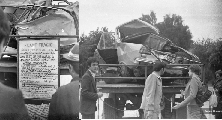 Fotografiile, publicate de arhiva Azopan, surprind un autoturism Dacia puternic avariat, urcat pe o platformă, expus în centrul orașului. Alături, un panou detaliază tragedia petrecută în seara de 27 septembrie 1981, în apropierea localității Moftinu Mic.