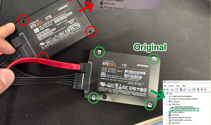 Pentru a verifica dacă este vorba despre un defect izolat sau despre o problemă mai gravă, firma a achiziționat un SSD identic – Samsung 870 EVO, dar de 1TB – dintr-un magazin fizic autorizat. „Am constatat diferențe clare de construcție, etichetare și comportament față de cel cumpărat prin eMAG Marketplace”, se arată în document.