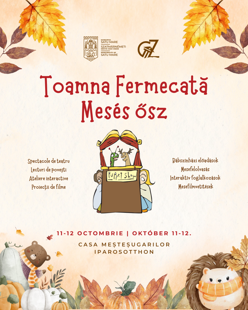 La finele săptămânii, în 11 și 12 octombrie, cei mici sunt așteptați la Casa Meșteșugarilor care, timp de două zile, devine tărâmul fermecat al poveștilor. Evenimentul „Toamna fermecată”, organizat de Primăria Municipiului Satu Mare și Centrul Cultural G. M. Zamfirescu, își propune să aducă în atenția copiilor de toate vârstele spectacole de teatru de păpuși, în limba română și limba maghiară, lecturi de povești, ateliere interactive și proiecții de filme. Copiii vor avea parte de o fascinantă călătorie în lumea basmelor, prin joc și imaginație descoperind tărâmuri fermecătoare.