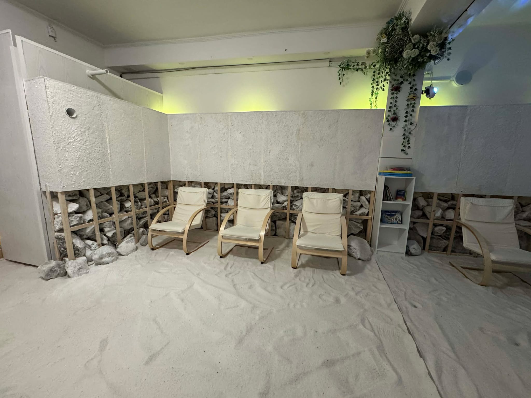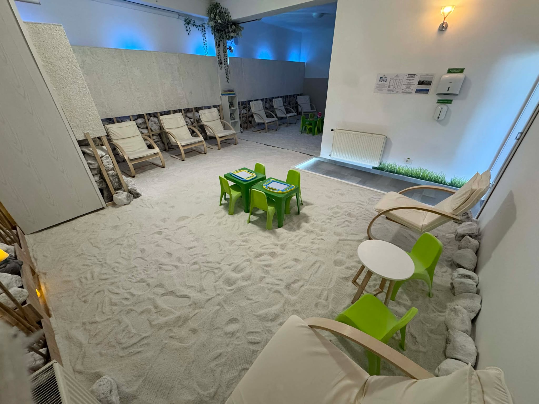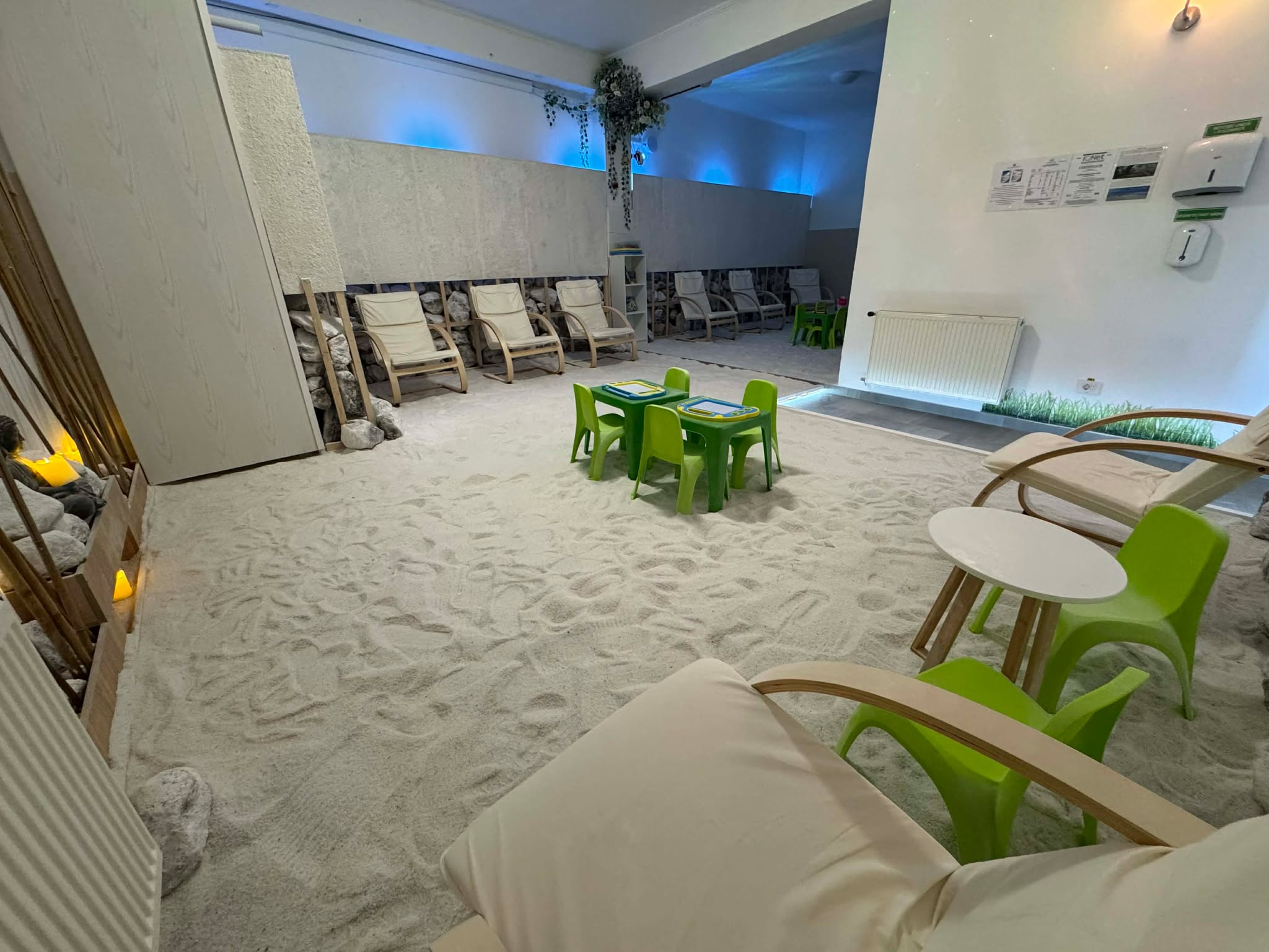 Spațiul este curat, modern și amenajat cu grijă: pereți acoperiți cu sare, șezlonguri comode, lumină ambientală și chiar colțuri dedicate lecturii. Centrul organizează și activități pentru copii, ceea ce transformă terapia într-o experiență plăcută și educativă.