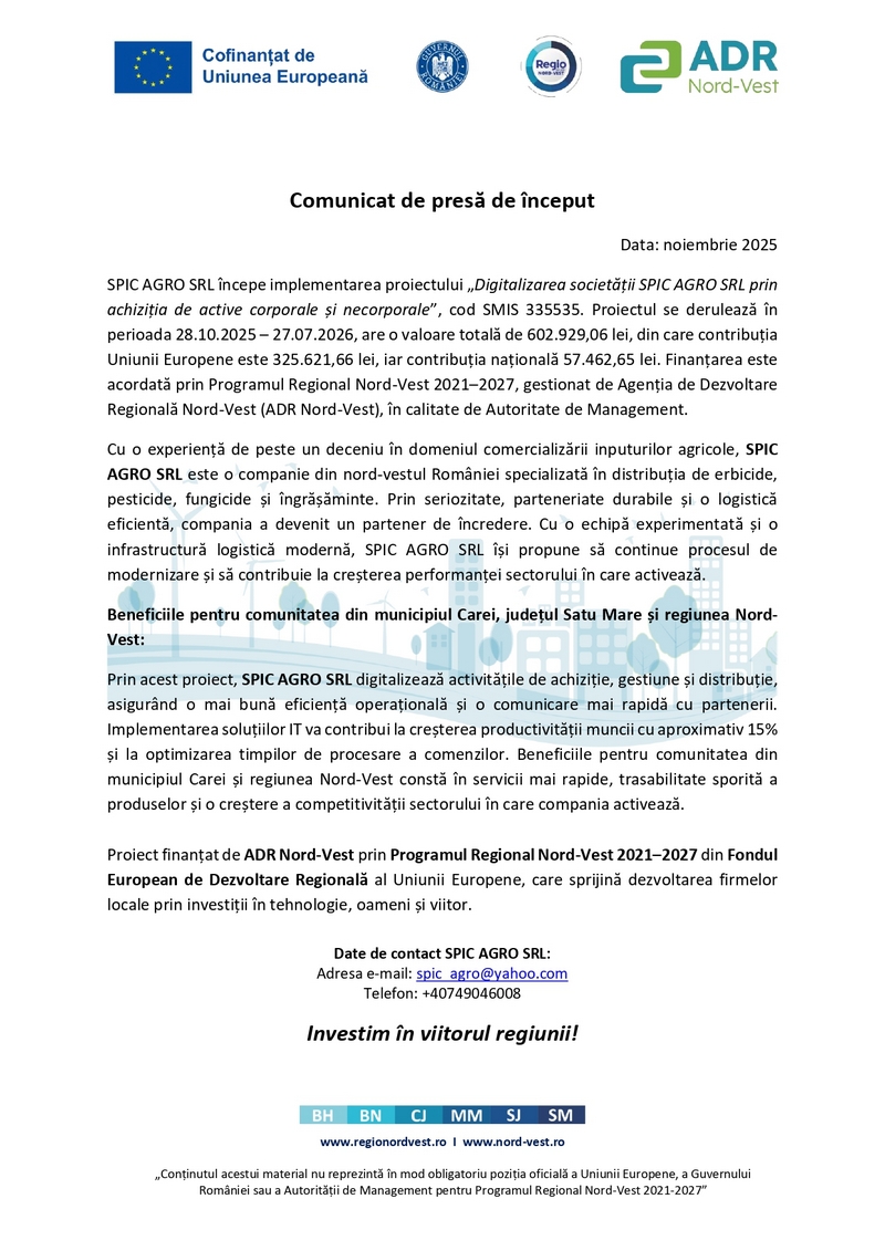 Publicitate Comunicat de presă – SPIC AGRO SRL astăzi, 08:16 Mai multe despre Comunicat de presă, SPIC AGRO SRL Navigare în articole Articolul următorFOTO/VIDEO. Start campaniei care dă viață Centrului Vechi. Doamnele din OFA, prezente în inima orașului: ,,Fii alături de noi!”Articolul anteriorSile Puşcaş, la Marius Tucă: Este o răzbunare politică, din cauză că am o relaţie de prietenie cu George Simion