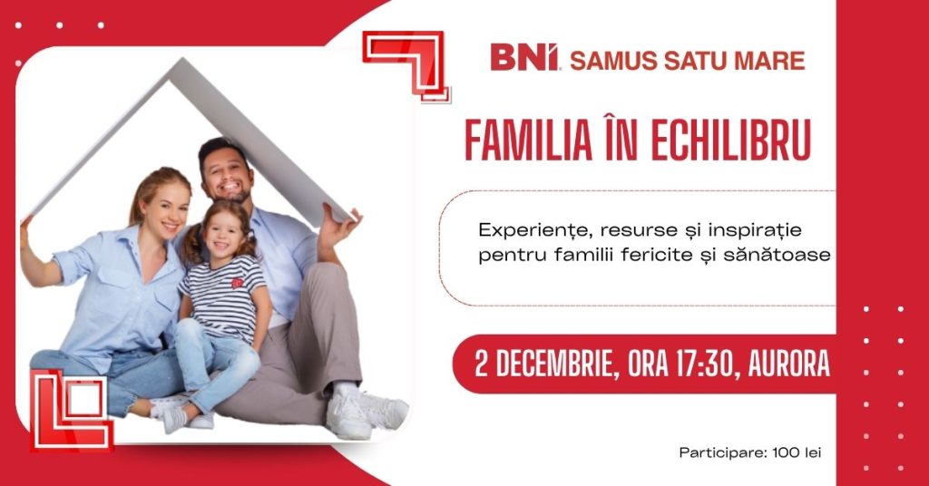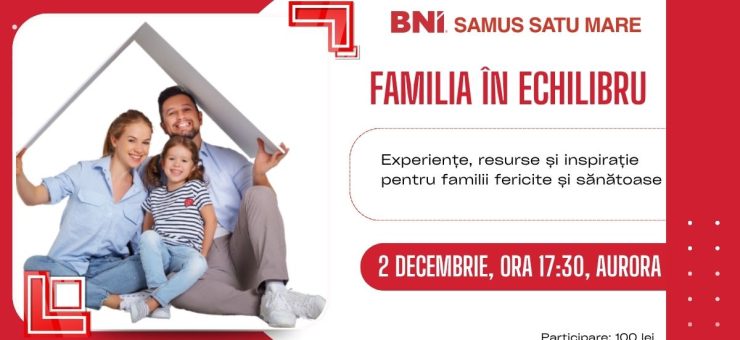 Marți, 2 decembrie, de la ora 17.30, la Hotel Aurora din municipiul Satu Mare, va avea loc evenimentul „Familia în echilibru”, organizat de Power Team Resurse Umane – BNI Samus Satu Mare, eveniment ce și își propune să ofere părinților soluții practice, resurse utile și sprijin real pentru gestionarea provocărilor din viața de zi cu zi.