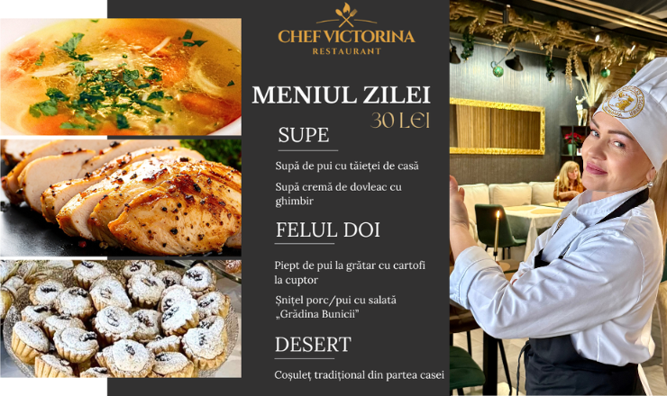 Începând de marți, 25 noiembrie, restaurantul Chef Victorina din centrul municipiului Satu Mare dă start meniului zilei, disponibil între orele 11:30 – 15:00, la locație sau pentru ridicare.