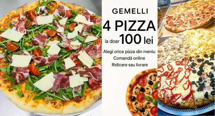 Pizzeria Gemelli Satu Mare introduce o promoție puternică pentru toți iubitorii de pizza: 4 pizza de 32 cm, la alegere, la doar 100 lei. Oferta este disponibilă exclusiv pentru comenzile online și este valabilă doar pe raza municipiului Satu Mare.
