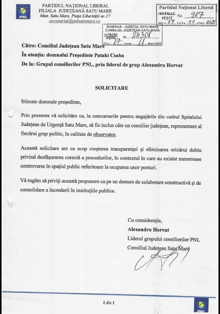 Consilierii județeni ai PNL au depus o solicitare oficială către conducerea Consiliului Județean Satu Mare. Ei cer ca fiecare concurs organizat de spital să fie monitorizat de un consilier județean, câte unul din fiecare grup politic, în calitate de observator. Măsura ar urma să asigure corectitudine și să elimine orice îndoială privind desfășurarea probelor.