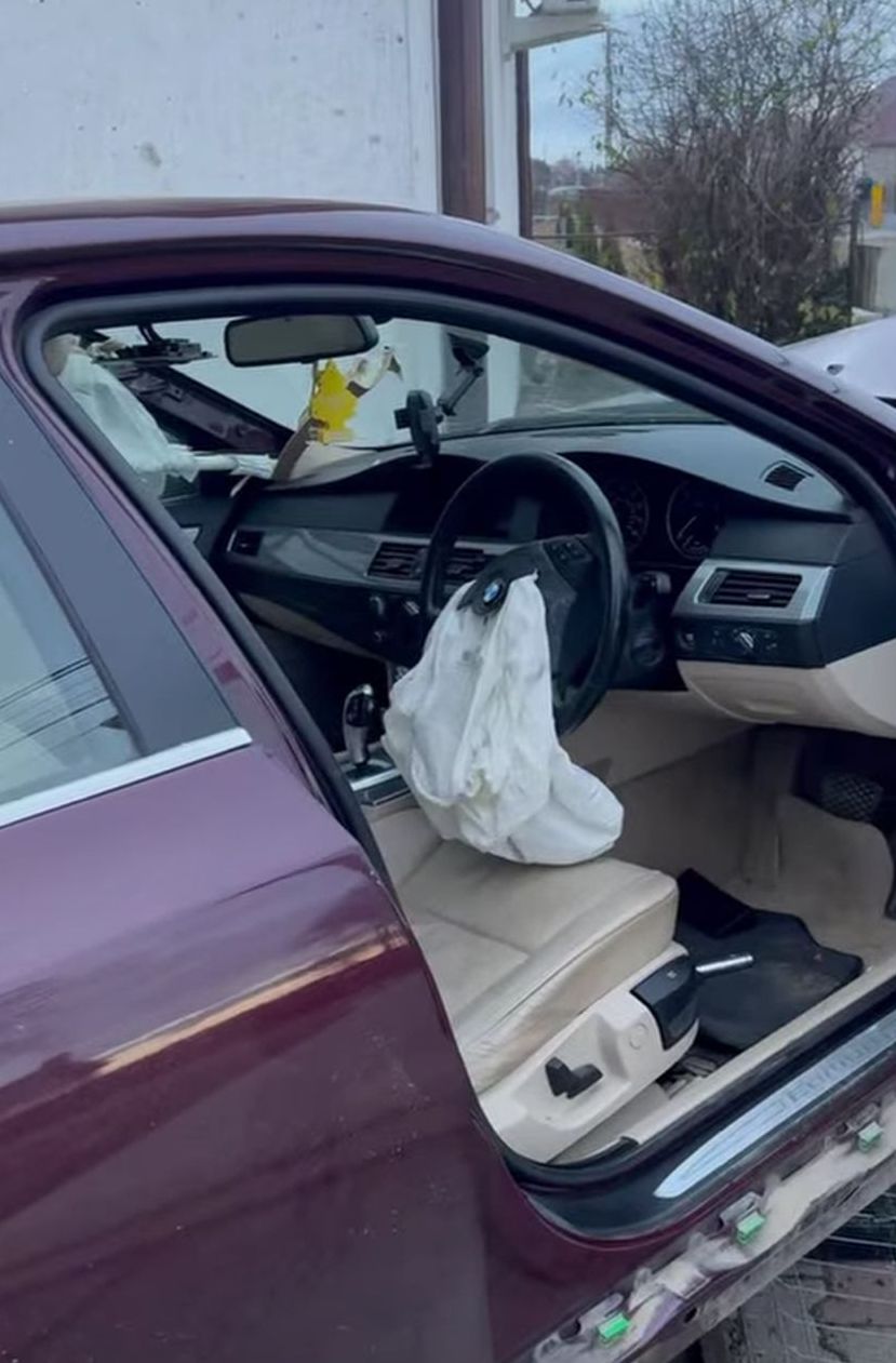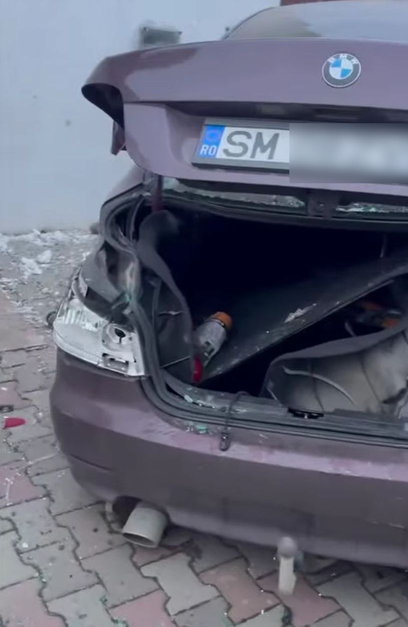 Păgubitul afirmă că poliţiştii au plecat şi l-au lăsat cu BMW-ul distrus în curte, astfel că nu poate ieşi cu maşina din curte.