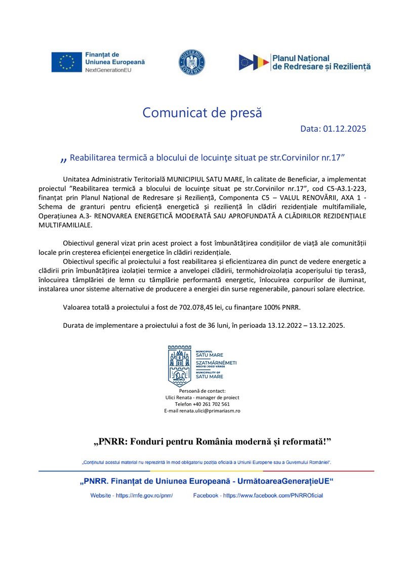 Locale Comunicat de presă: „ Reabilitarea termică a blocului de locuinţe situat pe str.Corvinilor nr.17” astăzi, 08:46 Mai multe despre Comunicat de presă, Corvinilor, Primăria Satu Mare Navigare în articole Articolul următorComunicat de presă: „Reabilitarea termică a blocului de locuinţe situat pe str.Păuleşti nr.3 bl.6”Articolul anteriorVIDEO. Un an de la alegerile prezidențiale: ce ar vota sătmărenii dacă ar merge din nou la urne?