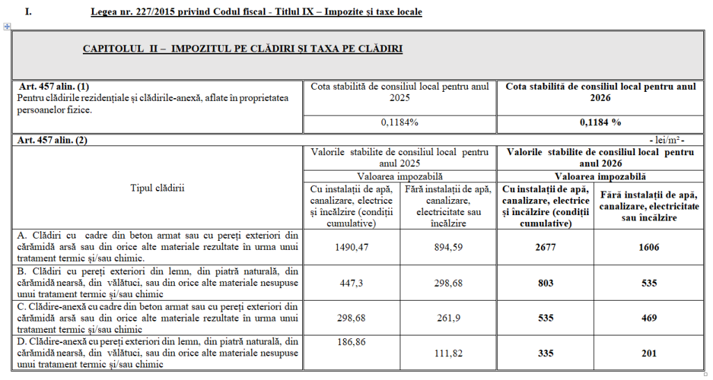 Cota de impozitare rămâne aceeași (0,1184%), însă valorile impozabile pe metru pătrat cresc semnificativ, ceea ce duce automat la impozite mai mari.