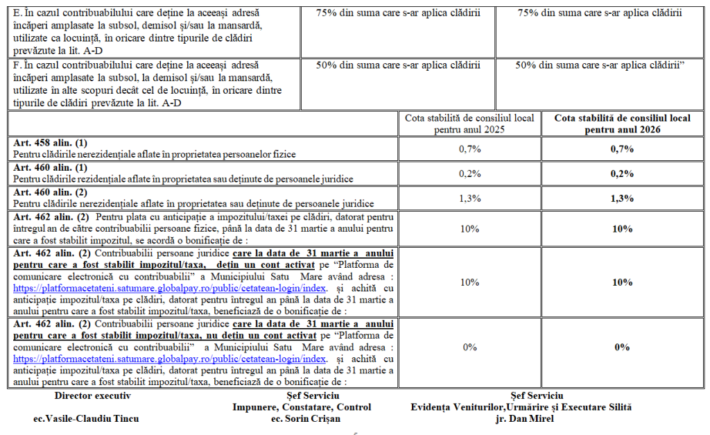 Noile niveluri de impozitare se vor aplica începând cu 1 ianuarie 2026. Bonificația de 10% pentru plata anticipată până la 31 martie rămâne valabilă pentru persoanele fizice și juridice care îndeplinesc condițiile stabilite.