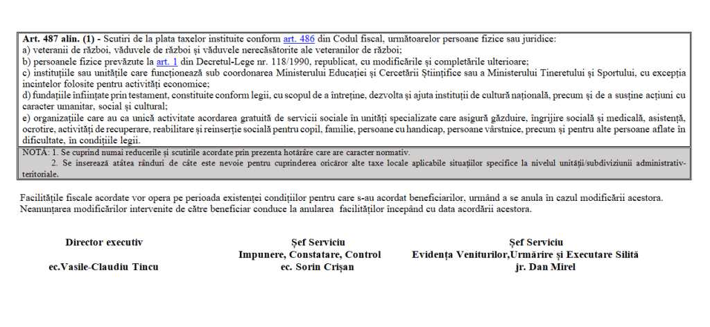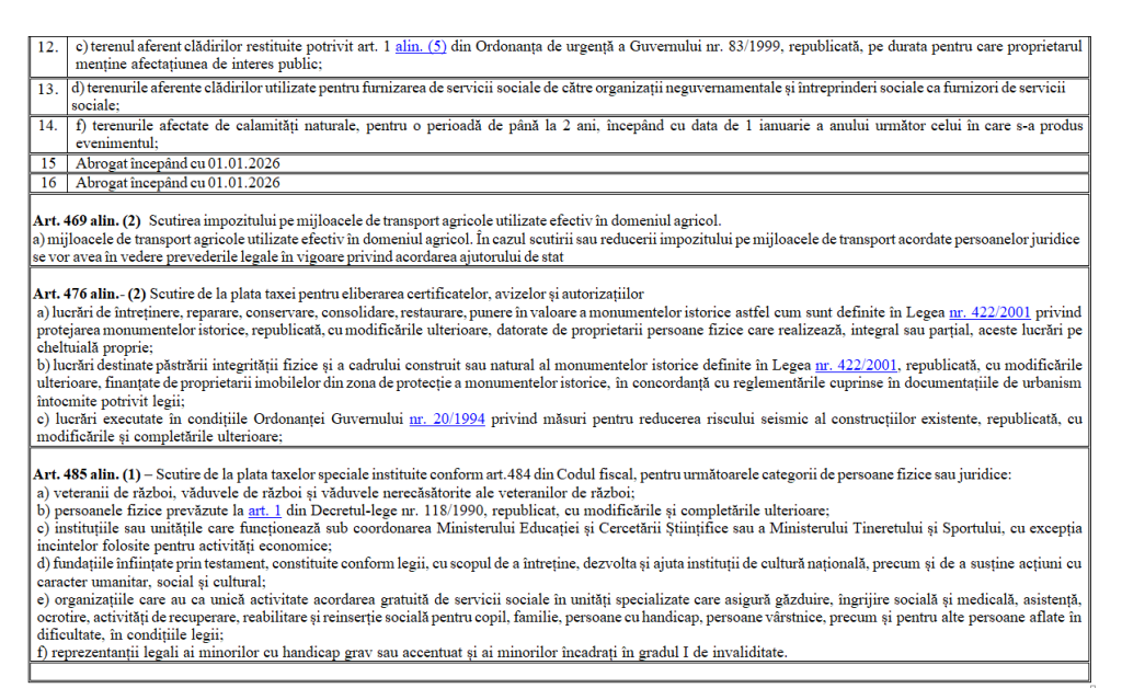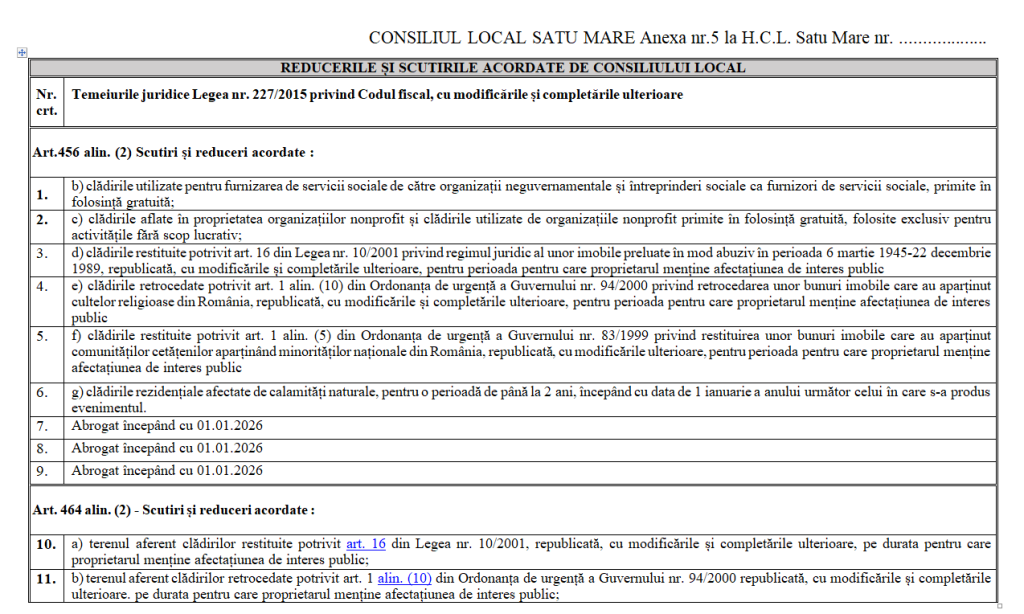 Consiliul Local a decis și eliminarea mai multor facilități fiscale începând cu 1 ianuarie 2026. Unele scutiri pentru clădiri și terenuri au fost abrogate, iar perioada de scutire pentru imobile afectate de calamități a fost limitată la maximum doi ani.