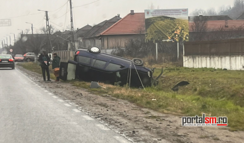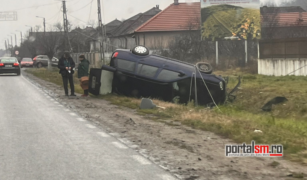 Evenimentul rutier s-a produs în localitatea Orașu Nou din județul Satu Mare, potrivit informațiilor PortalSM. Un șofer aflat la volanul unui autoturism ar fi pierdut controlul, a ieșit de pe carosabil și s-a răsturnat în șanțul de pe marginea drumului.