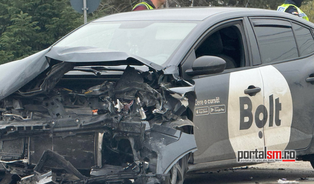 Accident grav, sâmbătă, în municipiul Satu Mare, după ce o mașină Bolt și un alt autoturism au intrat în coliziune.