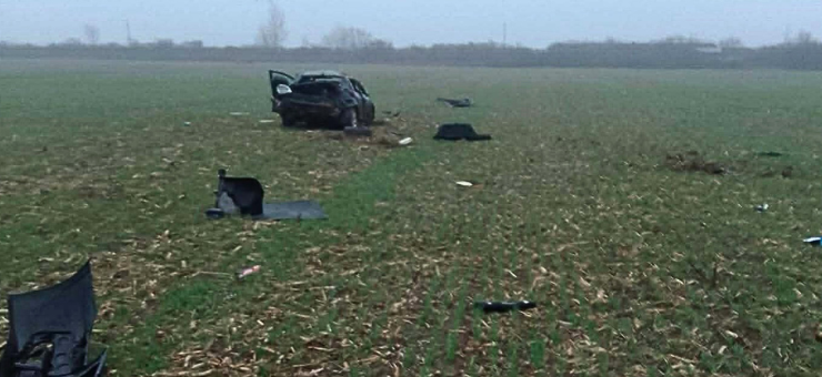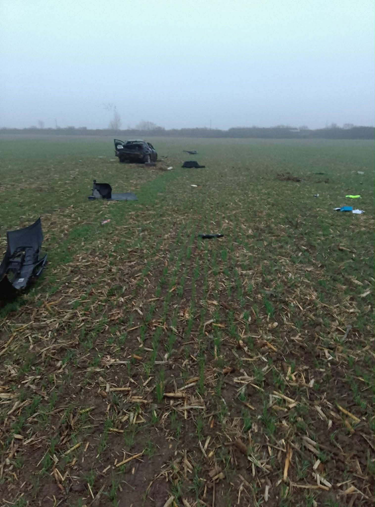 FOTO. Mașină făcută praf după ce s-a răsturnat pe câmp, în județul Satu Mare. La volan, un tânăr de 19 ani