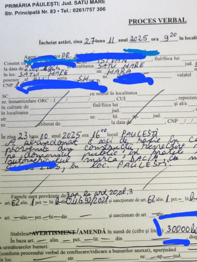 Amendă de 30.000 de lei pentru un sătmărean! Poliția Locală a aplicat o sancțiune de 30.000 de lei după ce o mașină venită din Satu Mare a fost surprinsă descărcând moloz pe raza localității Păulești. Primarul Zenoviu Bontea condamnă ferm gestul și spune că astfel de fapte nu vor fi tolerate. „Păuleștiul nu este groapă de gunoi!”, a transmis edilul.