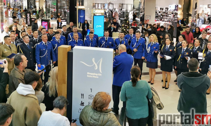 Flashmob în mall-ul din Satu Mare. Jandarmii au început colindatul. Atmosferă de sărbătoare, marți, în Shopping City Satu Mare, unde zeci de oameni s-au oprit din cumpărături pentru a urmări un moment special: un flashmob cu colinde susținut de Corul structurilor unite din sistemul național de ordine și siguranță publică.