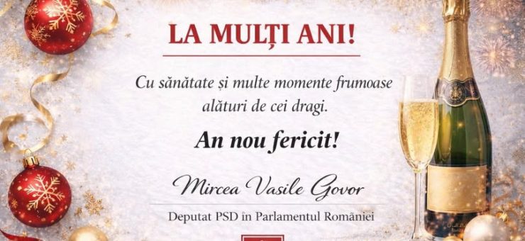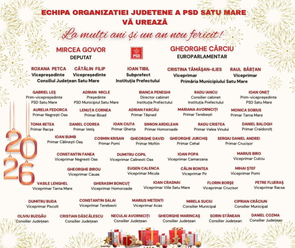 Președintele PSD Satu Mare, deputatul Mircea Govor, alături de întreaga echipă a Organizației Județene, transmite un călduros „La mulți ani!” tuturor sătmărenilor cu ocazia trecerii în noul an 2026.