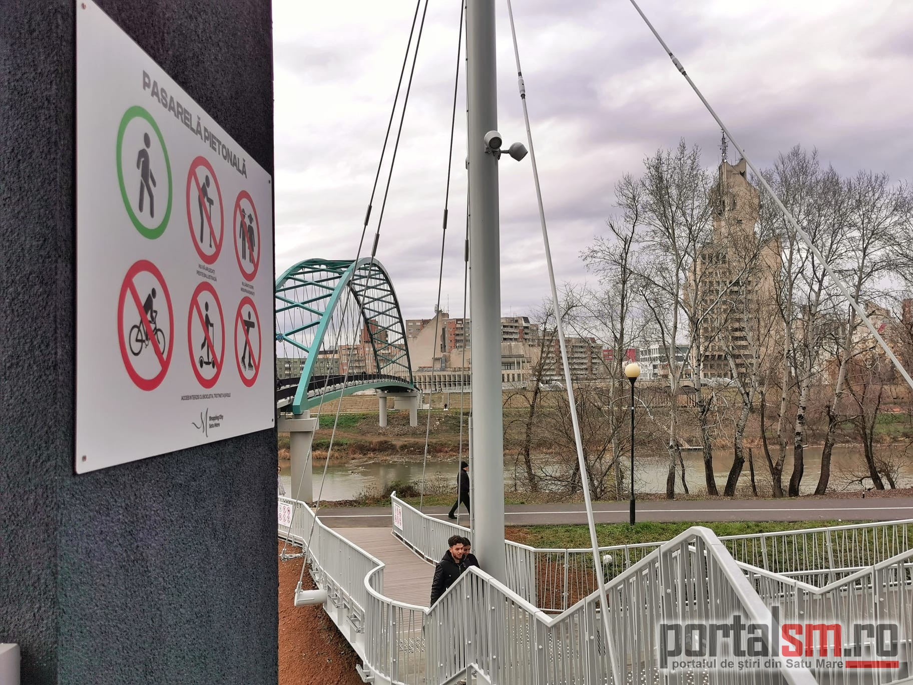 Pasarela este destinată exclusiv traficului pietonal, iar la ambele capete au fost amplasate panouri informative care arată clar ce este interzis pe pod: