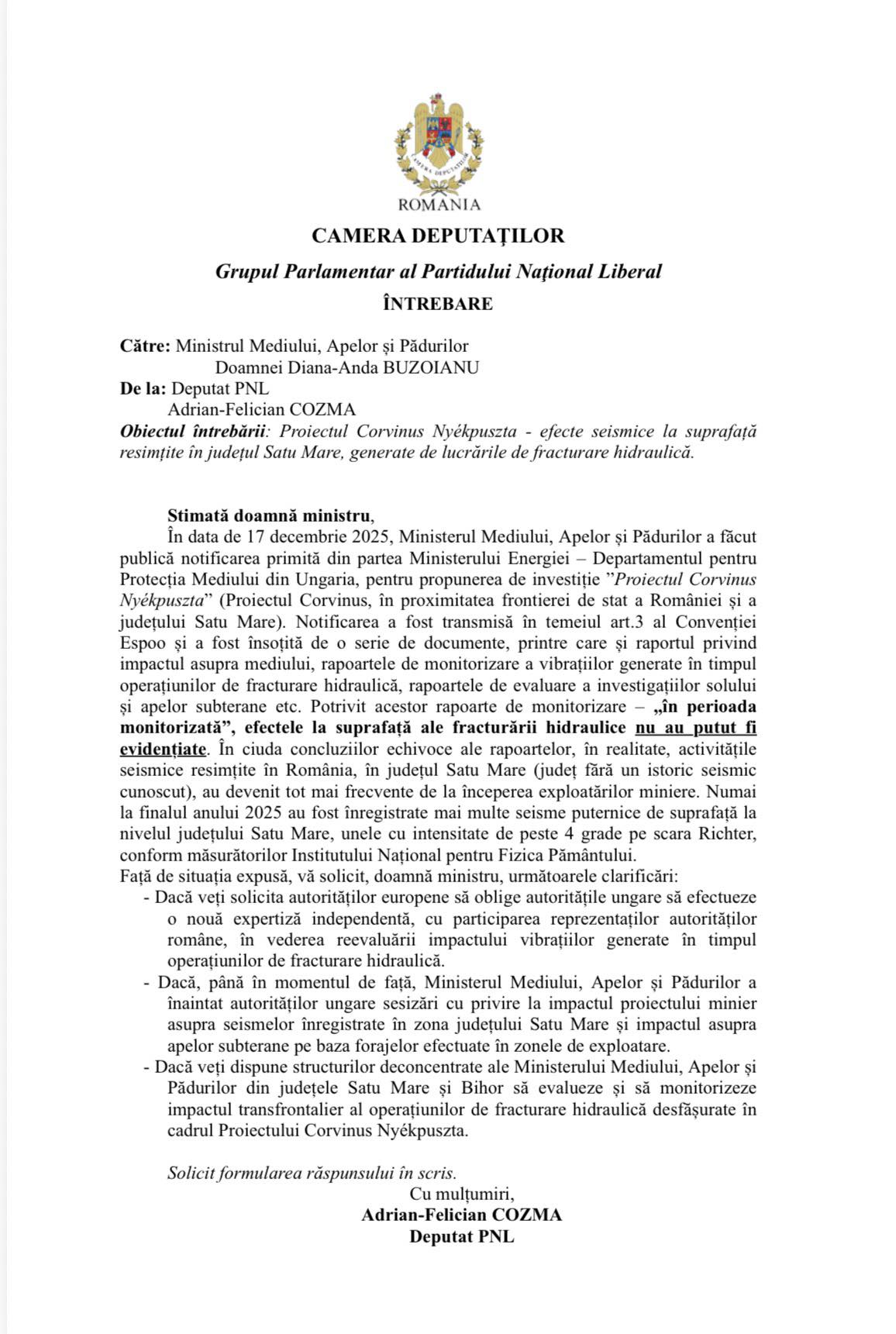 „Guvernul ungar desfășoară, începând cu anul 2023, activități de explorare și de exploatare de hidrocarburi prin metoda fracturării hidraulice pe granița de est a Ungariei cu România, fără ca autoritățile române de mediu să participe la realizarea studiilor de impact, deși au solicitat acest lucru în cursul lunii martie 2025. Noi am aflat cu întârziere doar despre activitățile de exploatare din vecinătatea județului Bihor, fără să cunoaștem toate demersurile și locurile de explorare prin forare la mare adâncime, realizate în vecinătatea noastră.