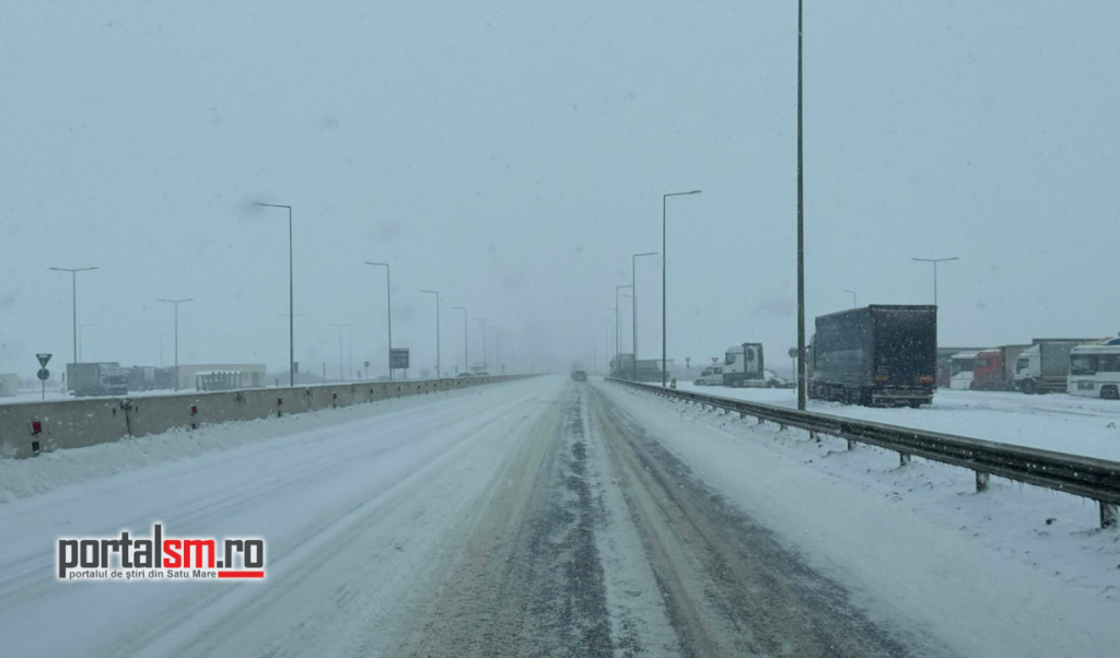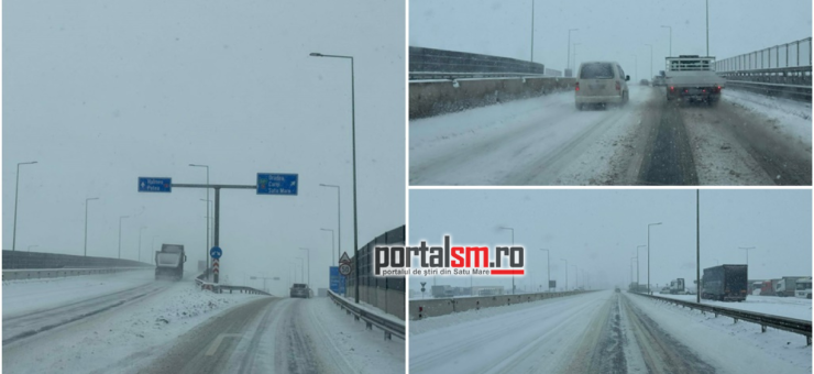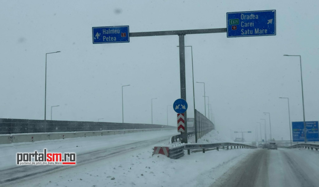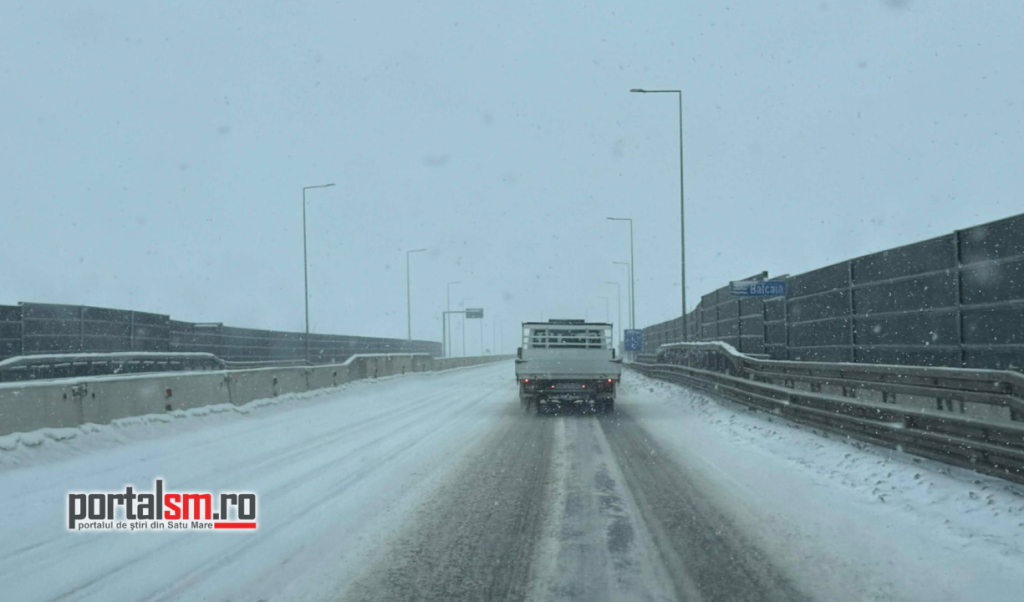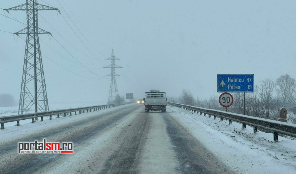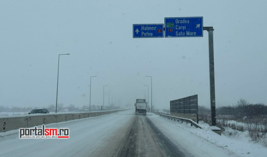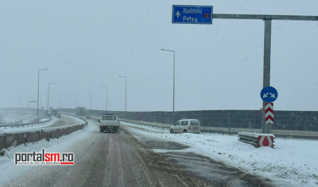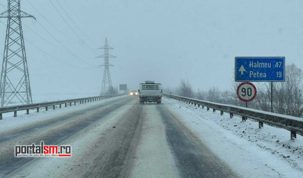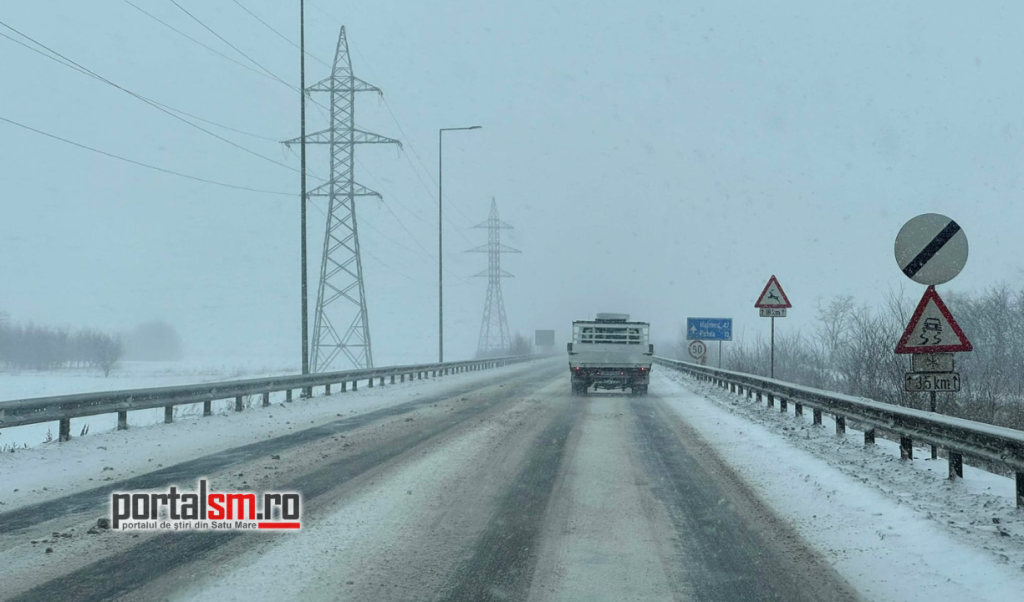 Ninsoarea viscolită a transformat Centura municipiului Satu Mare într-un adevărat derdeluș. Zăpada s-a depus pe carosabil, iar vântul puternic reduce vizibilitatea și face deplasarea extrem de dificilă.