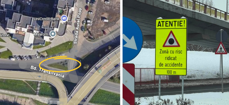 Un nou indicator rutier a fost montat pe Bulevardul Transilvania, în apropiere de intersecția cu Strada Aurel Popp, chiar lângă coborârea de sub pod. Panoul, foarte vizibil datorită culorii galben fosforescent, îi avertizează pe șoferi că intră într-o „zonă cu risc ridicat de accidente”, pe o distanță de 100 de metri.
