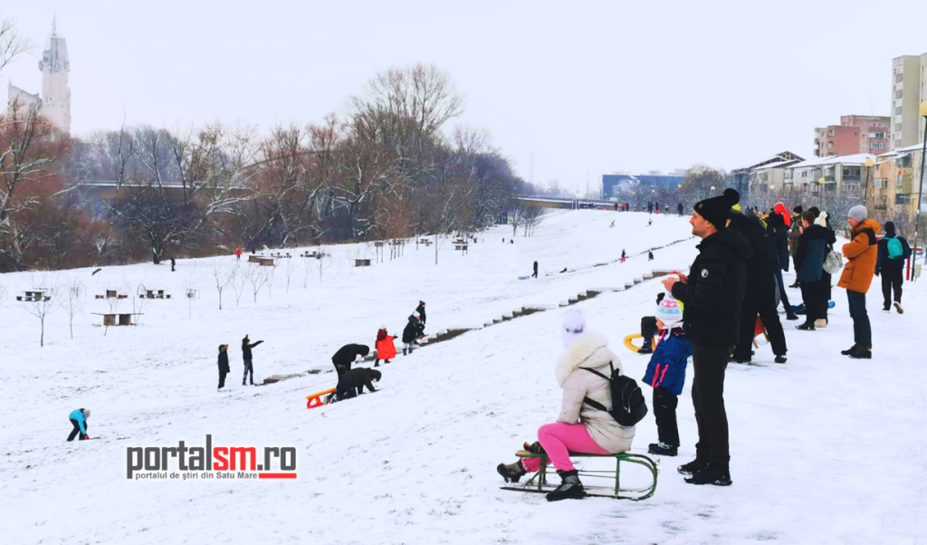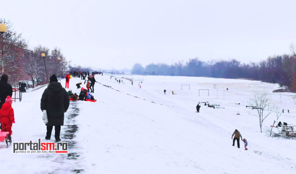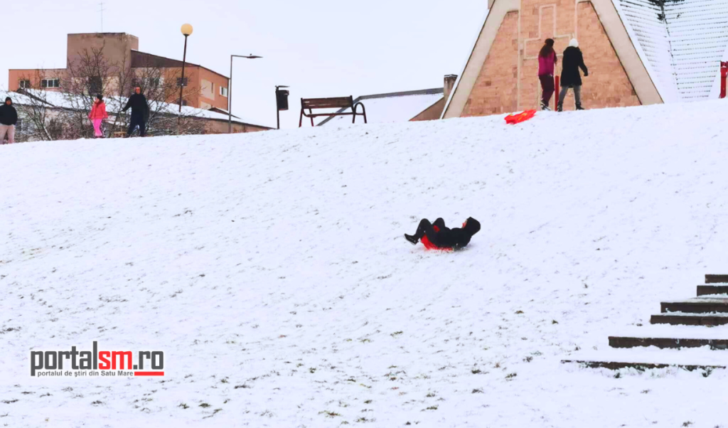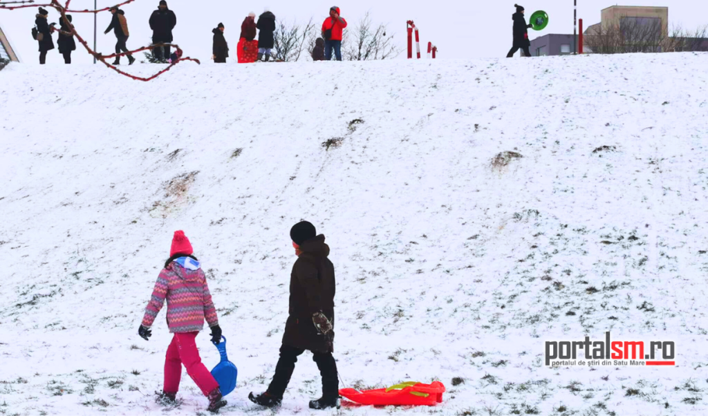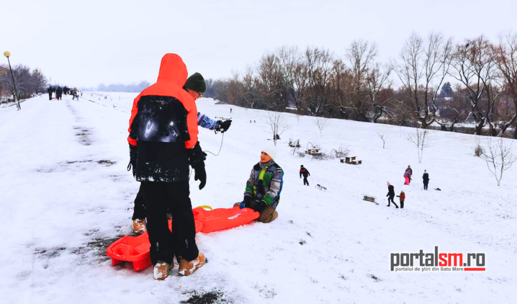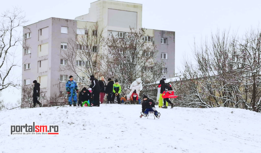 Ca pe vremuri: Copiii din Satu Mare au ieșit la săniuș pe dig. Satu Mare s-a trezit sub o pătură adevărată de zăpadă, iar bucuria nu a întârziat să apară. Odată cu prima ninsoare consistentă din această iarnă, copiii au ieșit în număr mare la săniuș pe digul Someșului, în cartierul Micro 16, transformând zona într-un adevărat loc de joacă.