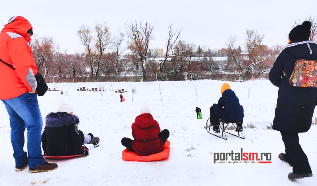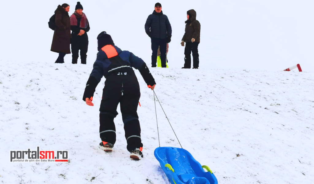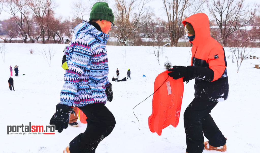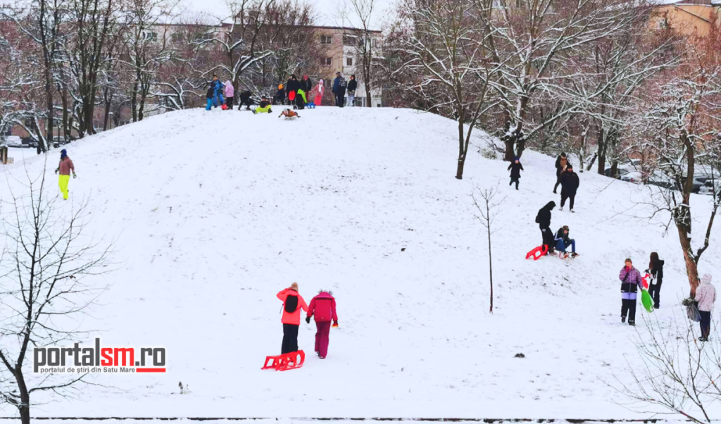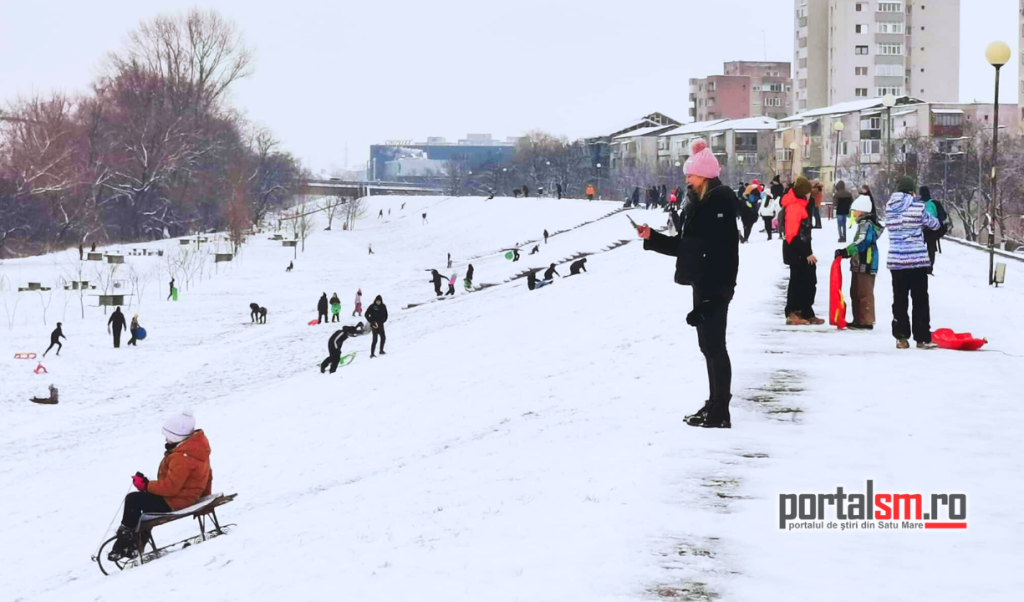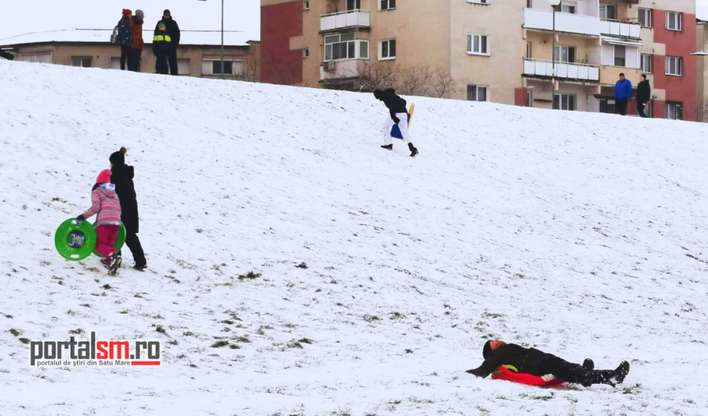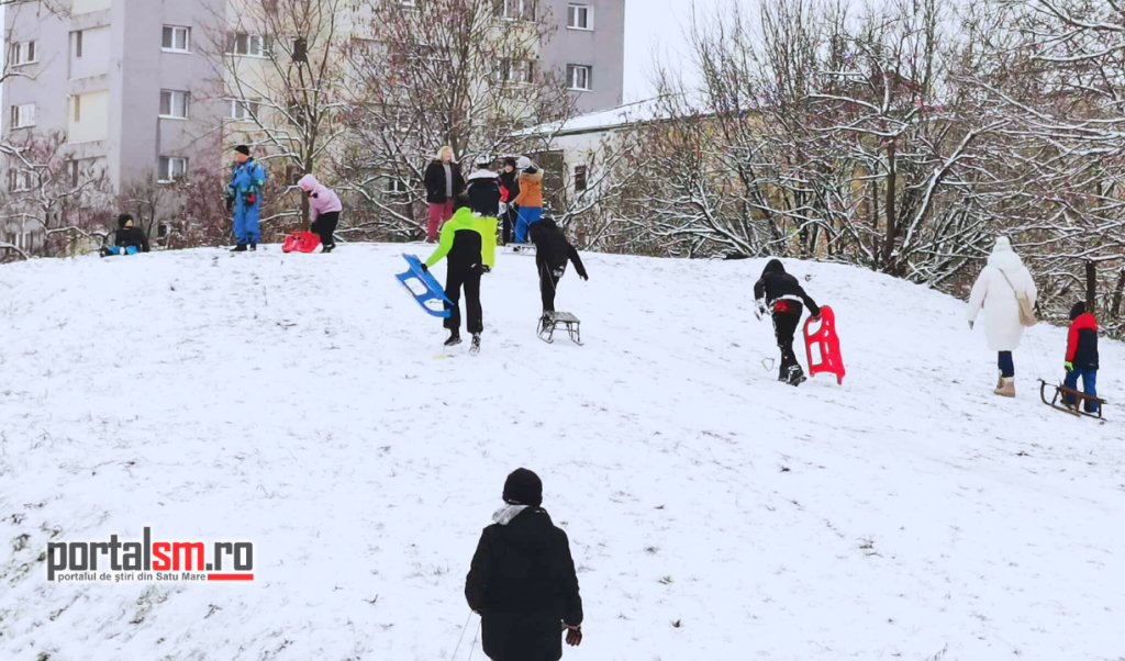 Ca pe vremuri: Copiii din Satu Mare au ieșit la săniuș pe dig. Satu Mare s-a trezit sub o pătură adevărată de zăpadă, iar bucuria nu a întârziat să apară. Odată cu prima ninsoare consistentă din această iarnă, copiii au ieșit în număr mare la săniuș pe digul Someșului, în cartierul Micro 16, transformând zona într-un adevărat loc de joacă.