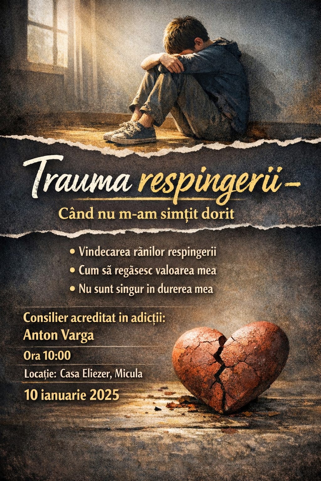 Primul grup de suport propus de Asociația Eliezer va aborda tema „traumei respingerii” – o formă de suferință emoțională legată de experiențele în care o persoană nu s‑a simțit dorită sau acceptată de cei din jur. Tema este aleasă pentru că astfel de experiențe sunt adesea profund personale și pot influența încrederea în sine, relațiile interumane și adaptarea la viața adultă.