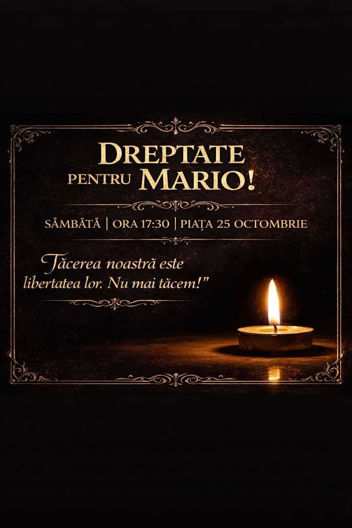 Un protest intitulat „Dreptate pentru Mario” va avea loc mâine, sâmbătă, de la ora 17:30, în Piața 25 Octombrie din municipiul Satu Mare. Organizatorii vor să facă public acest protest, prin intermediul PortalSM, iar mesajul principal transmis de organizatori este: „Tăcerea noastră este libertatea lor. Nu mai tăcem!”