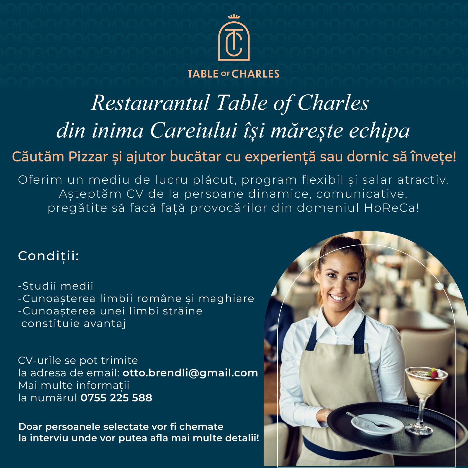 Restaurantul Table of Charles, situat în centrul municipiului Carei, a anunțat că își extinde echipa și caută să angajeze un pizzar și un ajutor de bucătar, persoane cu experiență sau dornice să învețe, pentru activitatea din domeniul HoReCa.