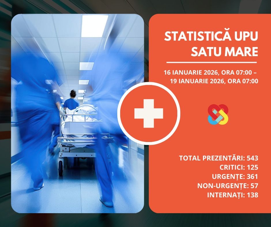 Spitalul Județean Satu Mare anunță că peste 500 de pacienți s-au prezentat la Unitatea de Primire Urgențe (UPU) în intervalul 16 ianuarie 2026, ora 07:00 – 19 ianuarie 2026, ora 07:00, activitatea desfășurându-se la un nivel ridicat pe parcursul întregului sfârșit de săptămână.