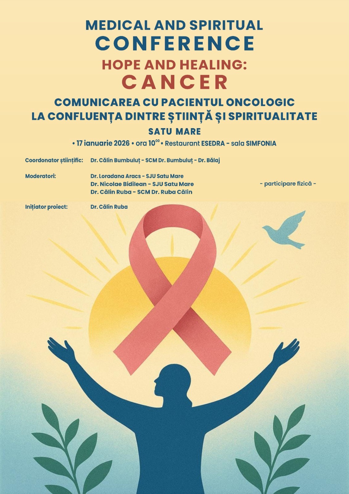 Conferință fără precedent la Satu Mare despre comunicarea cu pacientul oncologic. Pe 17 ianuarie 2026, la Restaurantul Esedra din Satu Mare, va avea loc un eveniment cu totul unic pentru oraș: o conferință în care medici, psihologi și teologi vor vorbi deschis despre unul dintre cele mai dificile momente din relația medic–pacient – comunicarea diagnosticului de cancer și comunicarea cu un astfel de pacient.