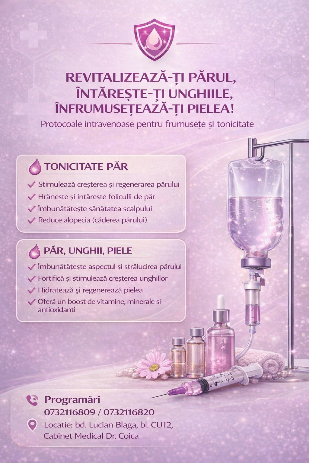 Persoanele interesate de îngrijirea pielii, a părului și a unghiilor pot opta pentru protocoale de tonifiere și revitalizare estetică, care îmbunătățesc aspectul părului, stimulează creșterea unghiilor și hidratează pielea în profunzime, printr-un mix eficient de vitamine și antioxidanți.