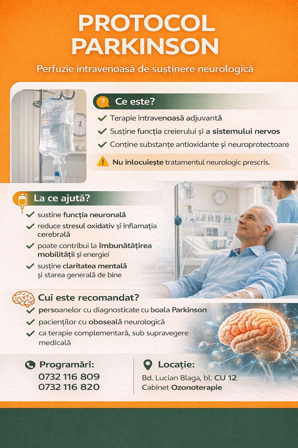 Sunt disponibile și protocoale complementare pentru pacienții cu boala Parkinson sau boala Alzheimer, axate pe susținerea funcției neuronale și a sistemului nervos, fără a înlocui tratamentul neurologic prescris.