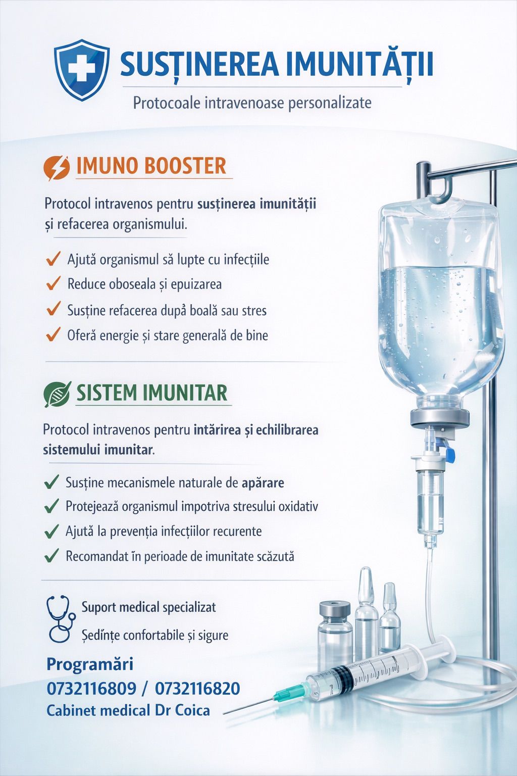 Pentru întărirea și echilibrarea sistemului imunitar, cabinetul oferă două protocoale eficiente: IMUNO BOOSTER și Sistem Imunitar. Acestea contribuie la refacerea organismului după infecții, reduc oboseala, ajută la prevenirea îmbolnăvirilor recurente și protejează împotriva stresului oxidativ.