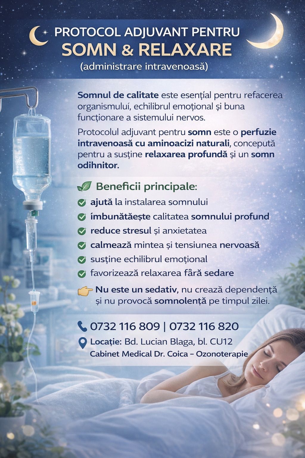 Un alt protocol apreciat este cel pentru somn și relaxare, bazat pe perfuzii cu aminoacizi naturali, fără efect sedativ. Acesta favorizează instalarea somnului, reduce anxietatea și susține echilibrul emoțional, fiind o alternativă sigură pentru cei care se confruntă cu tulburări de somn fără a dori medicație clasică.
