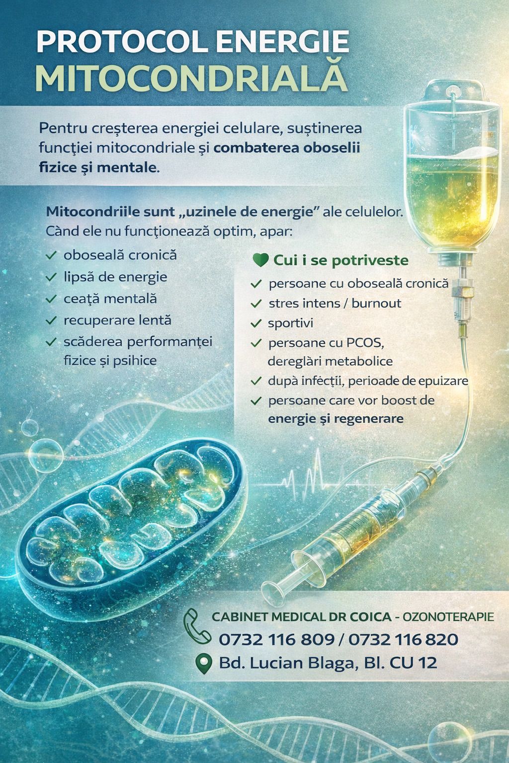 Protocolul pentru susținerea funcției mitocondriale este recomandat în cazuri de oboseală cronică, stres intens, recuperare lentă sau scăderea performanței fizice și psihice. Acest tratament susține producția de energie la nivel celular și poate aduce un efect vizibil în starea generală a organismului.