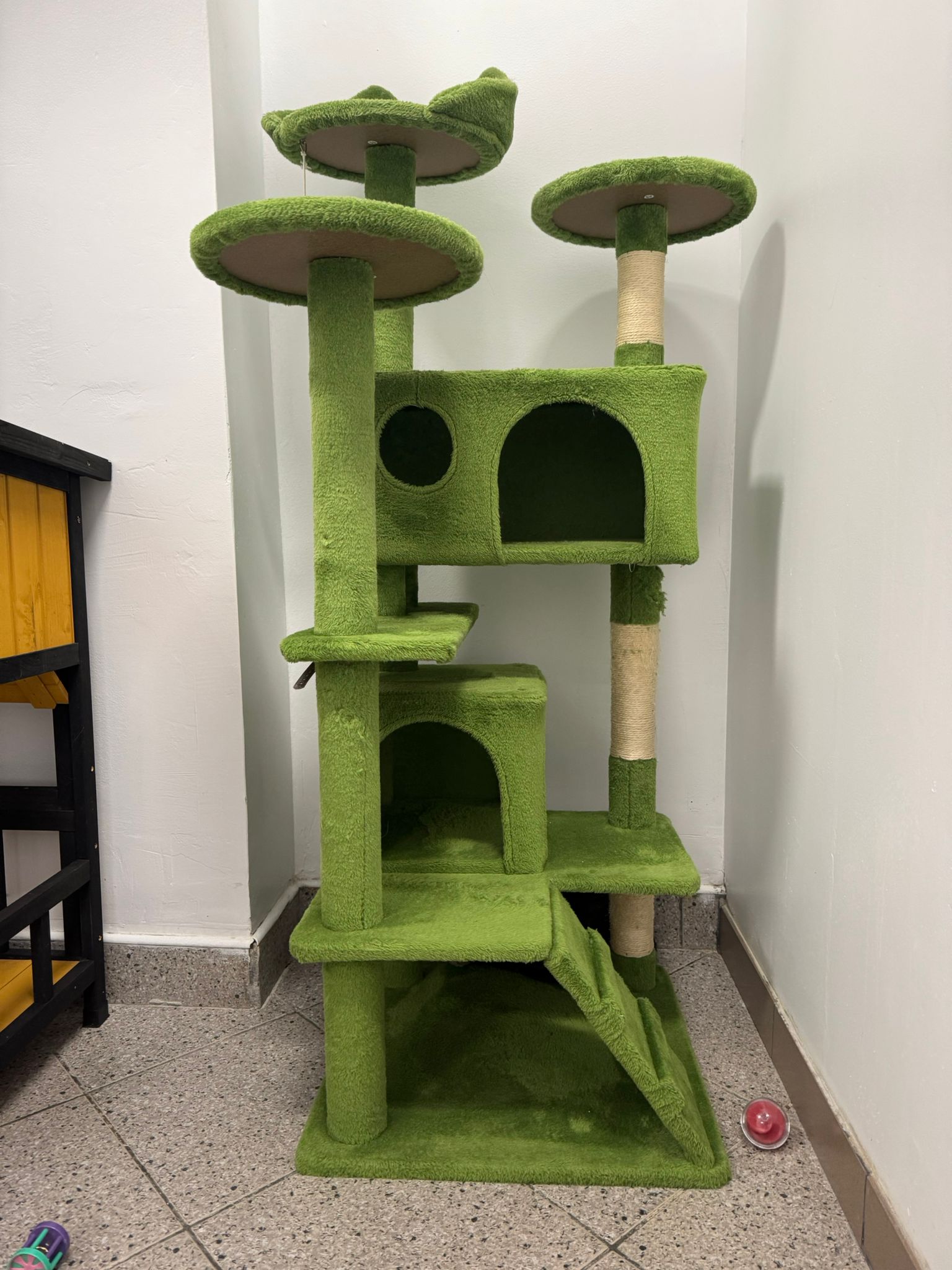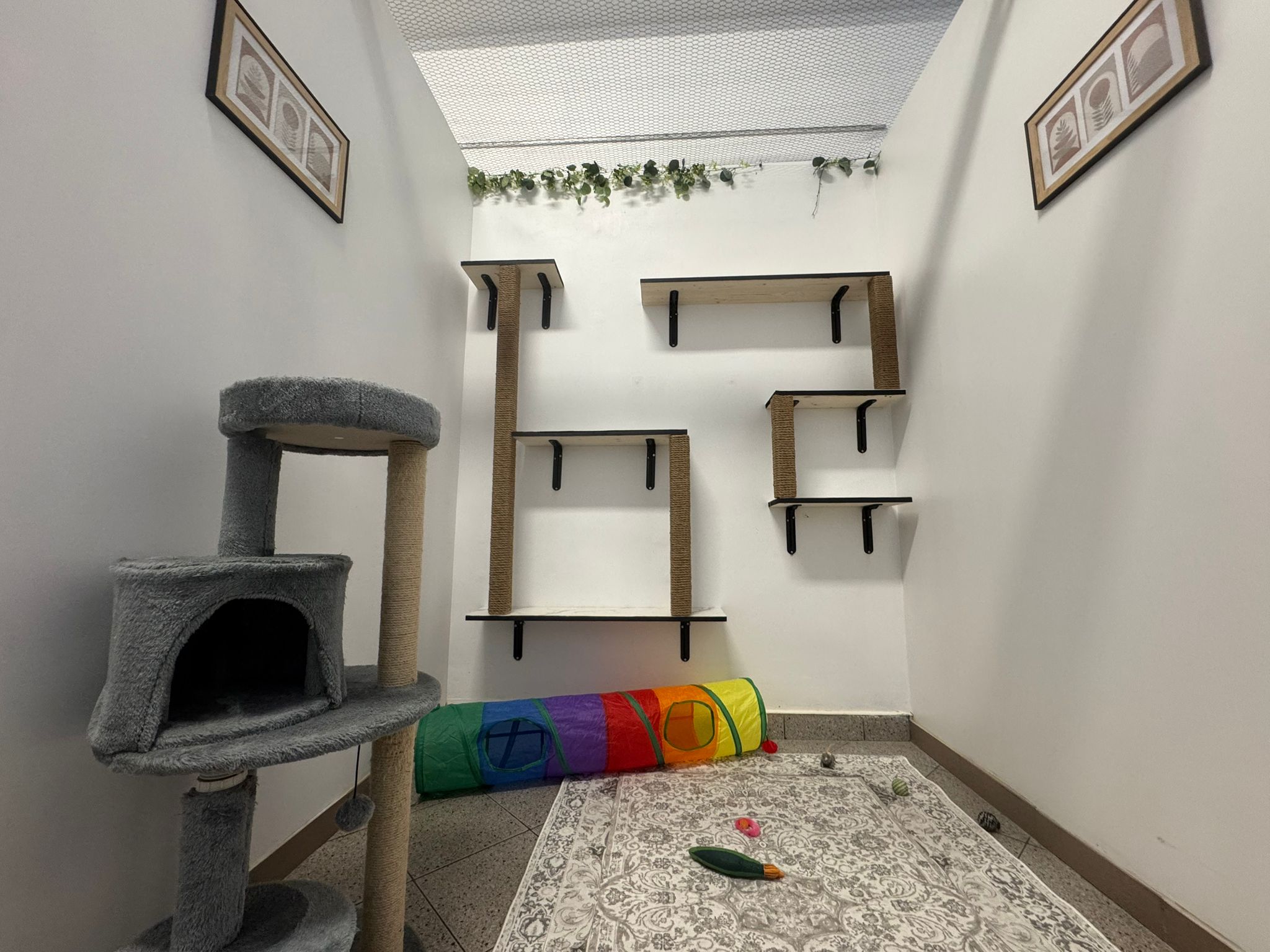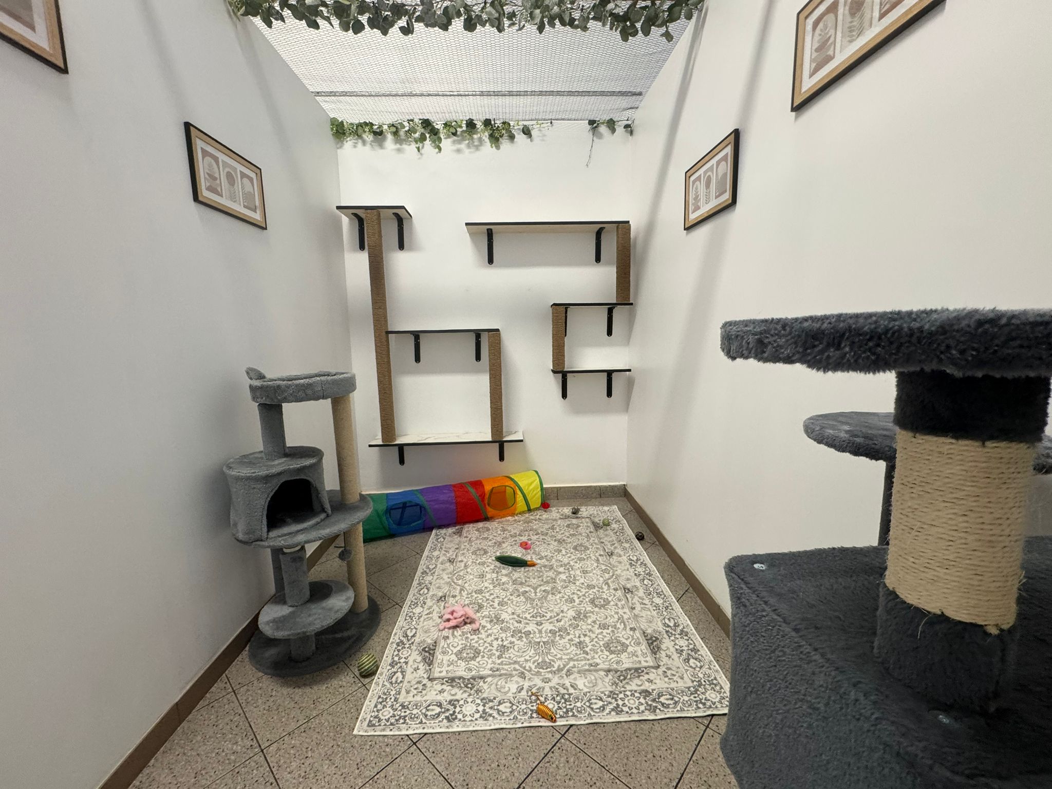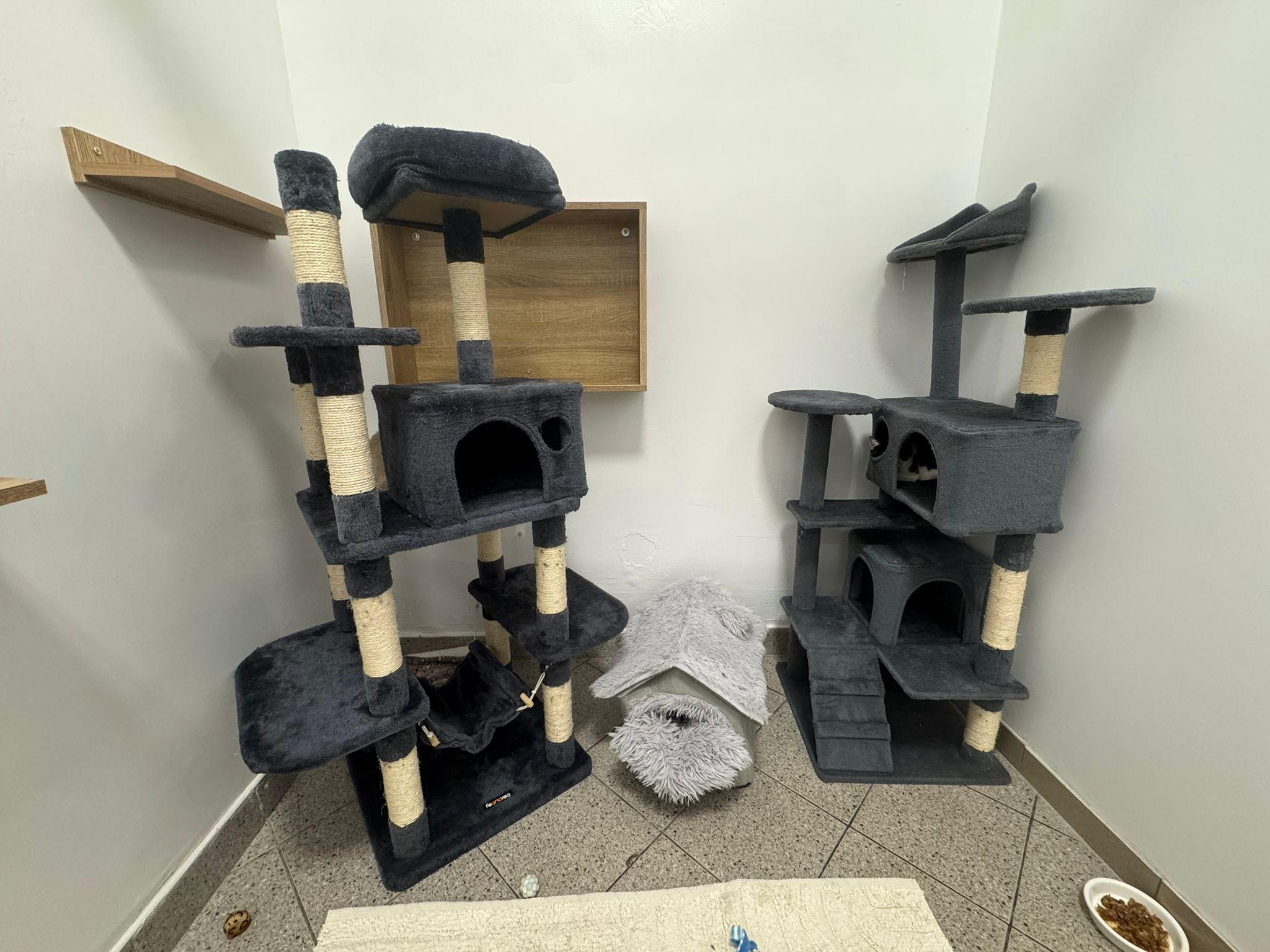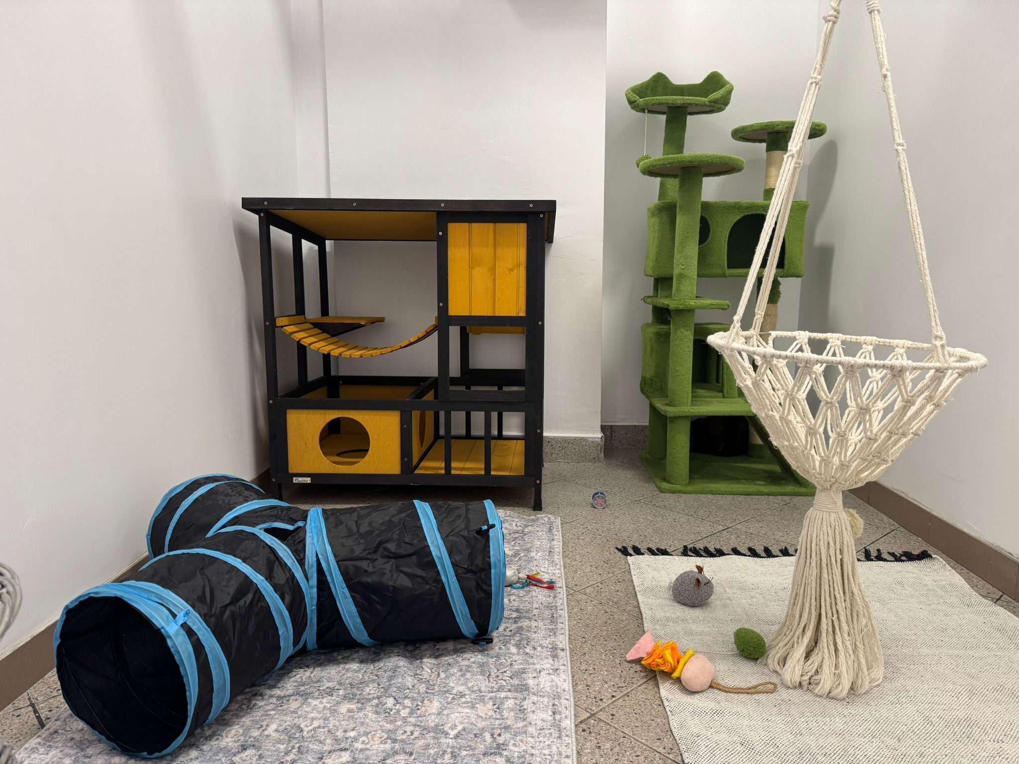Hotelul dispune de 6 boxe individuale, fiecare amenajată astfel încât pisicile să beneficieze de spațiu propriu, liniște și confort. Fiecare boxă este dotată cu castel pentru cățărat, căsuțe pentru odihnă și jucării, astfel încât animalele să fie active și relaxate pe durata șederii.