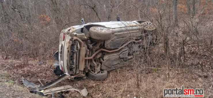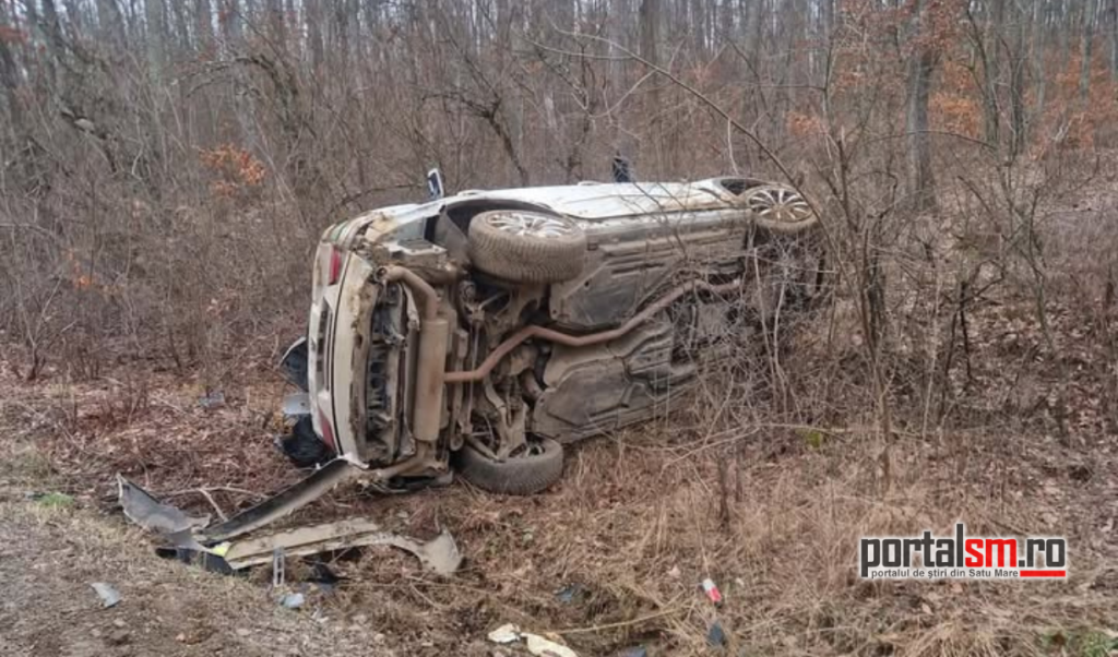 O mașină a ieșit în decor, miercuri, în județul Satu Mare. Autoturismul a ,,zburat” de pe drum și s-a răsturnat.