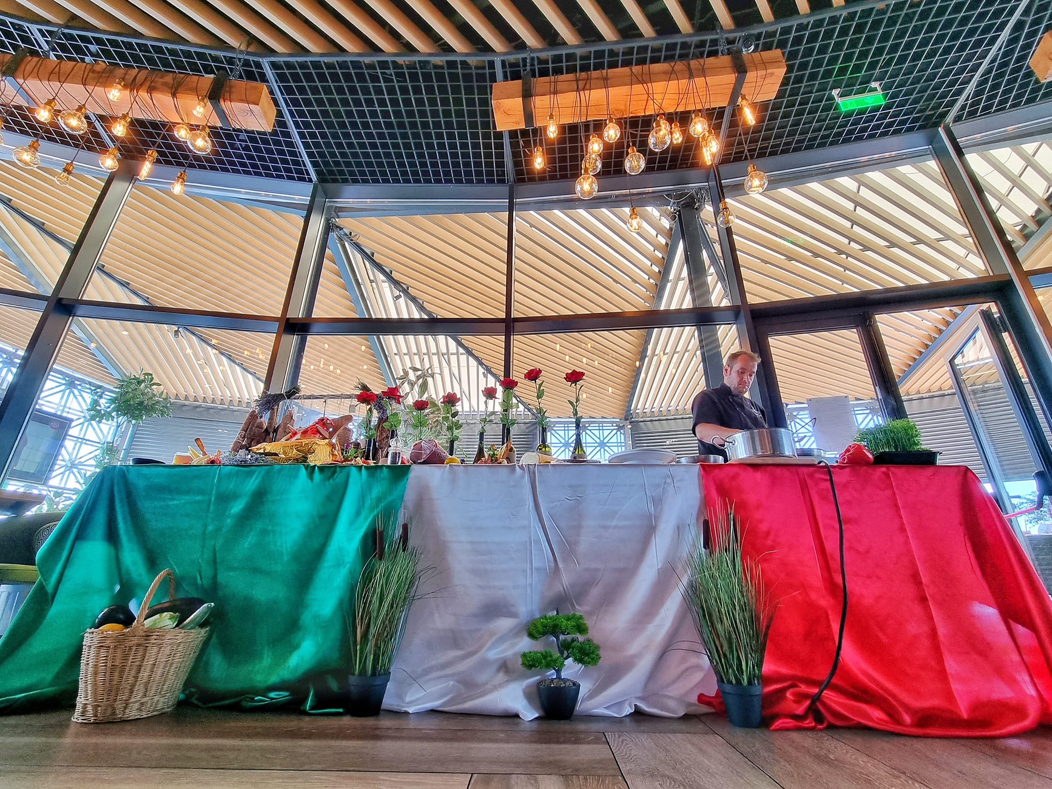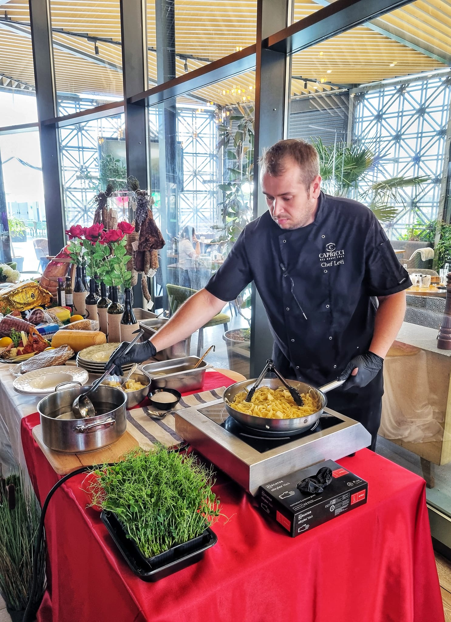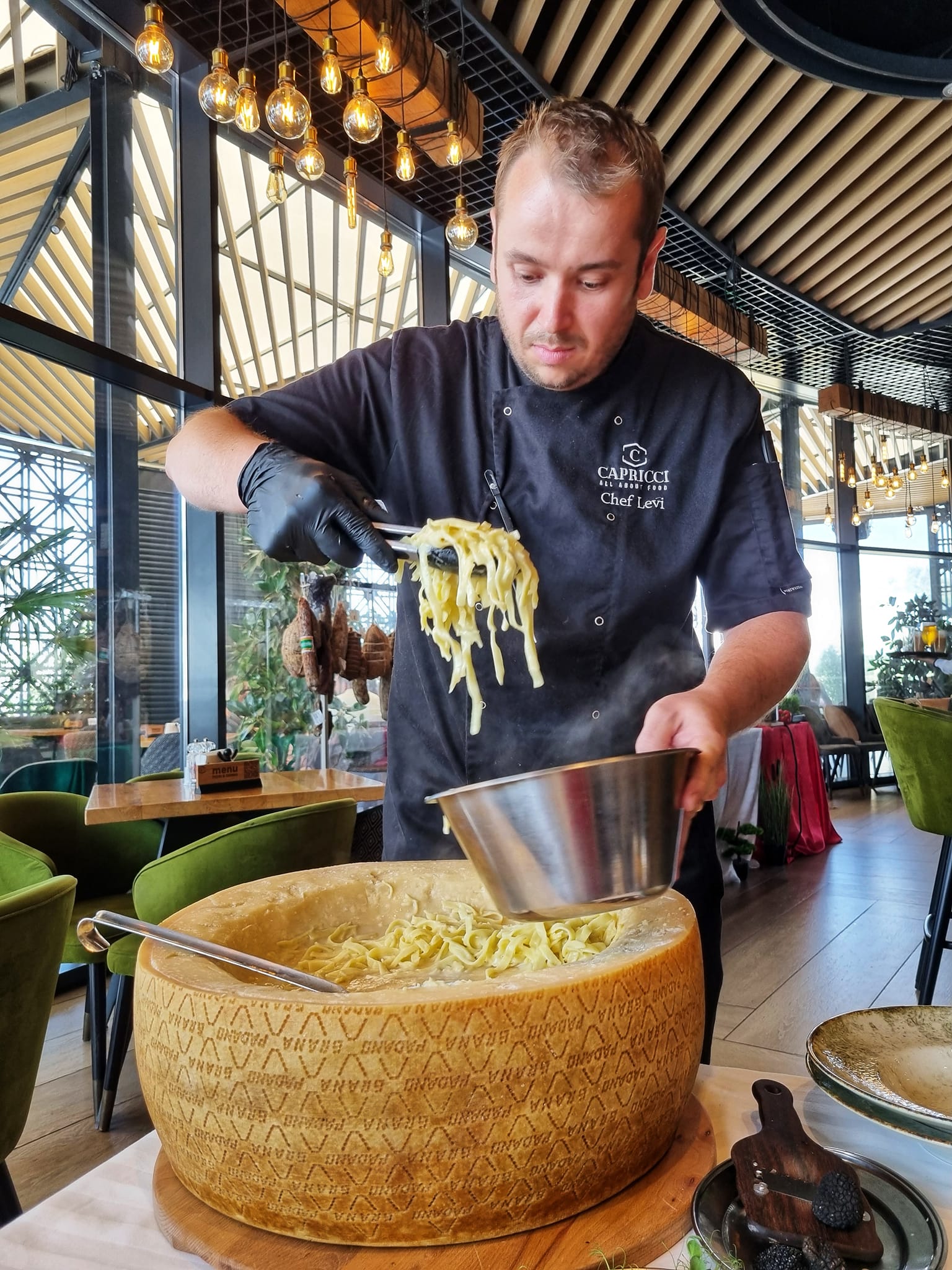 Pe parcursul zilei, oaspeții vor avea ocazia să urmărească momente spectaculoase de gătit chiar în restaurant. Printre atracțiile principale se numără preparatele realizate în roată de parmezan, pizza pregătită pe loc și alte specialități italiene, realizate în fața clienților. Atmosfera va fi completată de arome autentice și ingrediente specifice bucătăriei italiene.