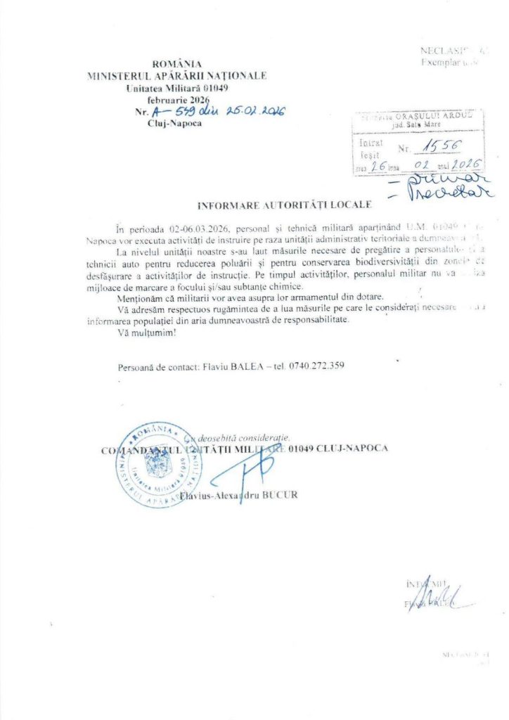 Armata face exerciții în județul Satu Mare. În perioada 2 – 6 martie 2026, Unitatea Militară 01049 Cluj-Napoca va desfășura exerciții și activități de instruire pe raza orașului Ardud, județul Satu Mare.