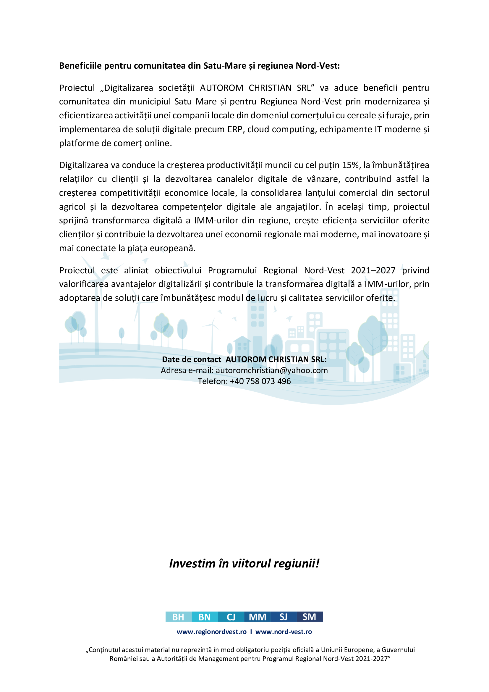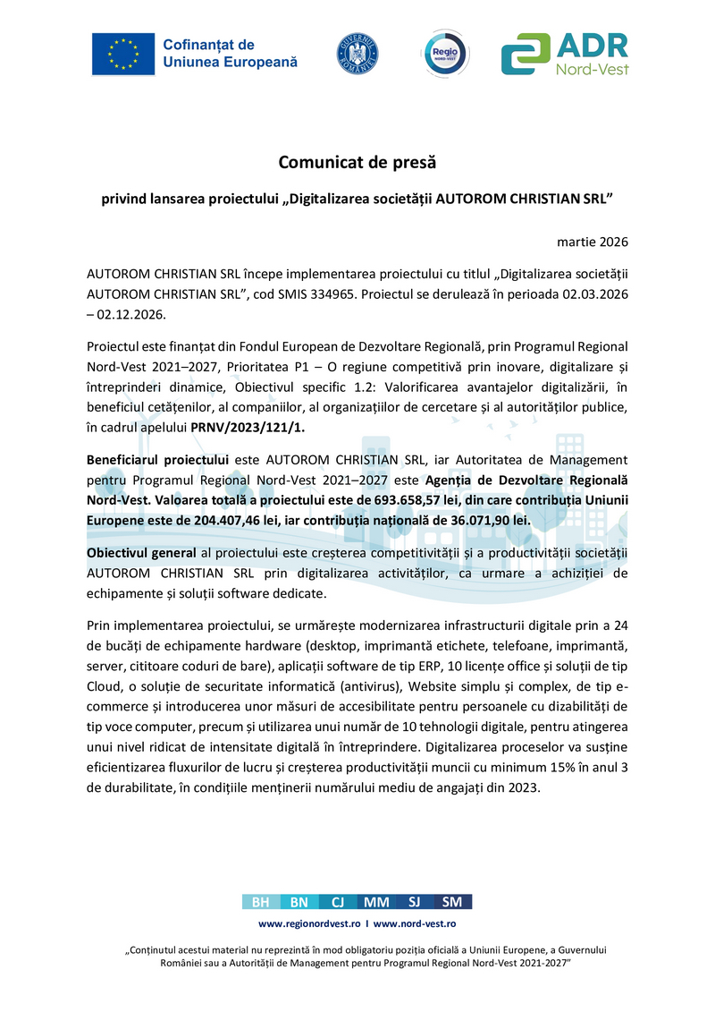 Locale Comunicat de presă privind lansarea proiectului „Digitalizarea societății AUTOROM CHRISTIAN SRL” astăzi, 15:18 Mai multe despre ADR Nord-Vest, Autorom Christian SRL, Comunicat de presă, Satu Mare Navigare în articole Articolul următorBeat și fără permis, un sătmărean a intrat cu mașina într-un gard. Apoi a fugit de la locul accidentului