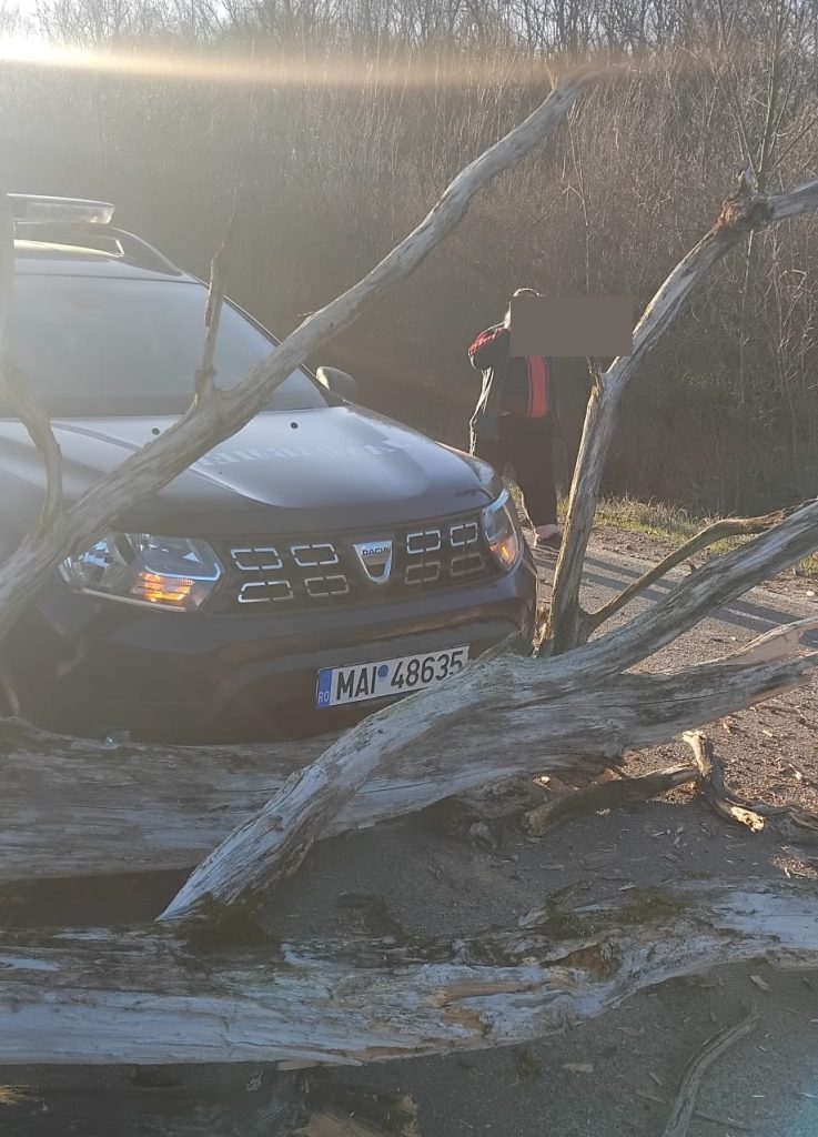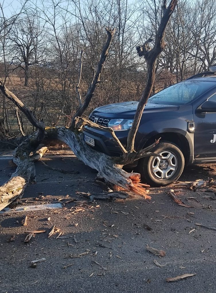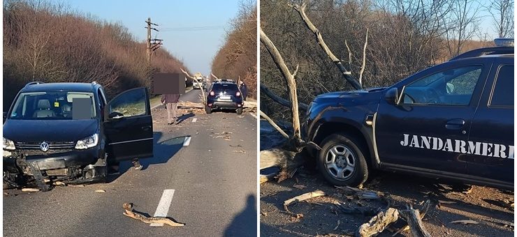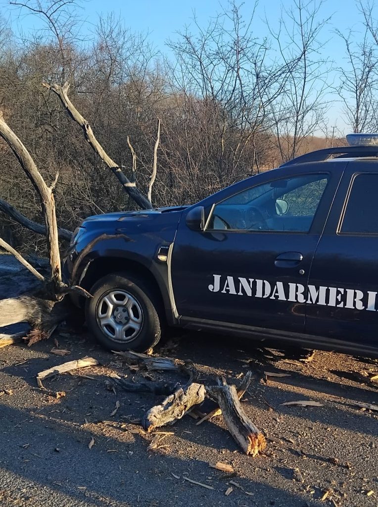 Un copac uscat s-a prăbușit în această dimineață, între orașul Livada și comuna Orașu Nou, județul Satu Mare, provocând un incident rutier. Arborele a căzut direct pe carosabil și a lovit două autovehicule care circulau în acel moment: o mașină civilă și o autospecială aparținând Inspectoratului de Jandarmi Județean Satu Mare.