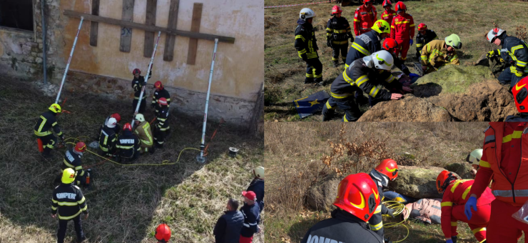 FOTO. Operațiune de salvare într-o localitate din județ! Alunecare de teren, persoană prinsă sub dărâmături (Exercițiu)