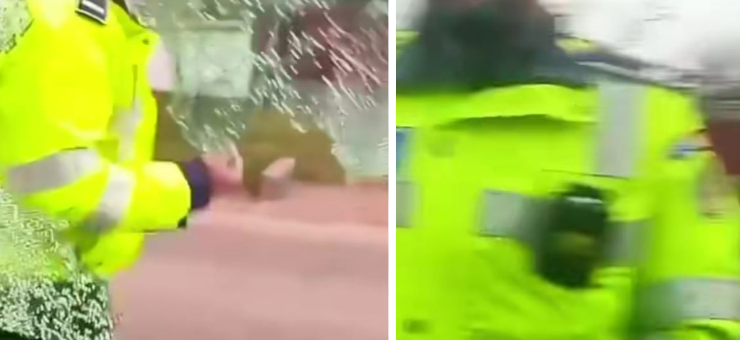 După mai multe minute în care au încercat să-l convingă să coboare, polițiștii au intervenit în forță, au spart geamul mașinii cu un baston telescopic și l-au imobilizat pe șofer, care a fost ulterior încătușat.