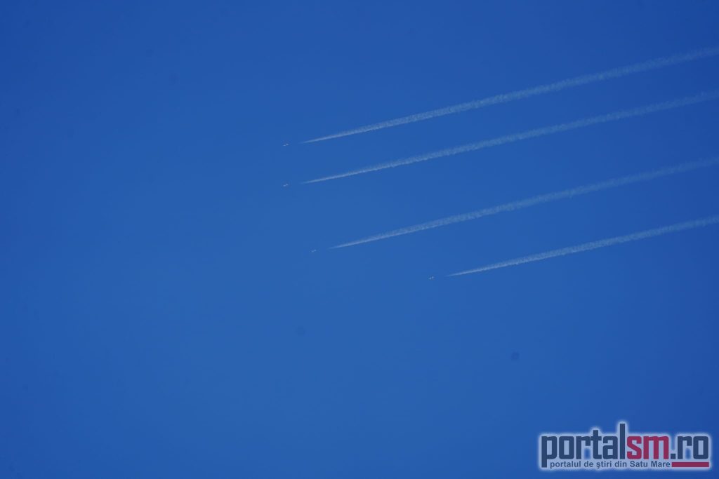 Mișcări militare pe cer, la Satu Mare! Formație de F-18, urmată de un avion greu de transport. O formație de patru avioane de vânătoare F-18 a tranzitat spațiul aerian al județului Satu Mare, urmată la aproximativ cinci minute de un avion militar de transport greu Airbus A400M Atlas.
