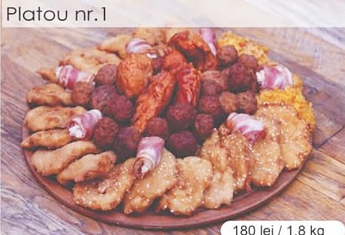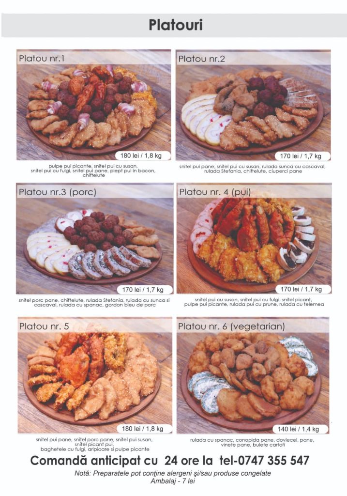 - platouri cu carne de pui și porc, în diverse combinații (șnițele, chifteluțe, rulade, pulpe picante),