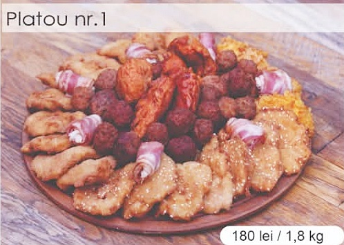 - platouri cu carne de pui și porc, în diverse combinații (șnițele, chifteluțe, rulade, pulpe picante),