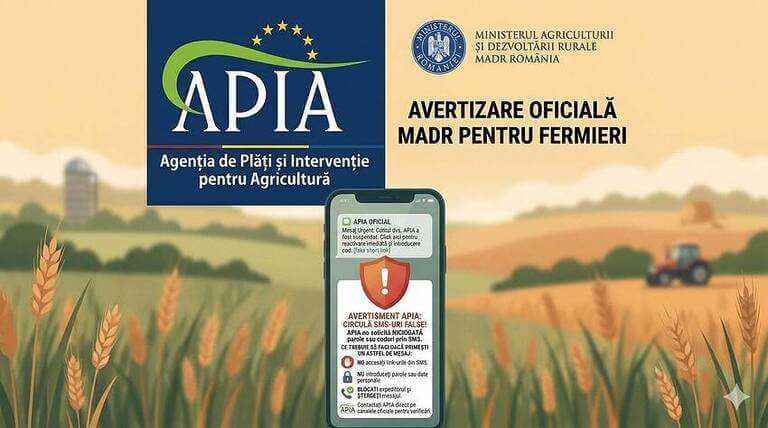 Mesajele conțin link-uri către un site neoficial (plata-apia.ro), fără nicio legătură cu APIA. Fermierii sunt sfătuiți să ignore aceste mesaje și să le șteargă imediat.