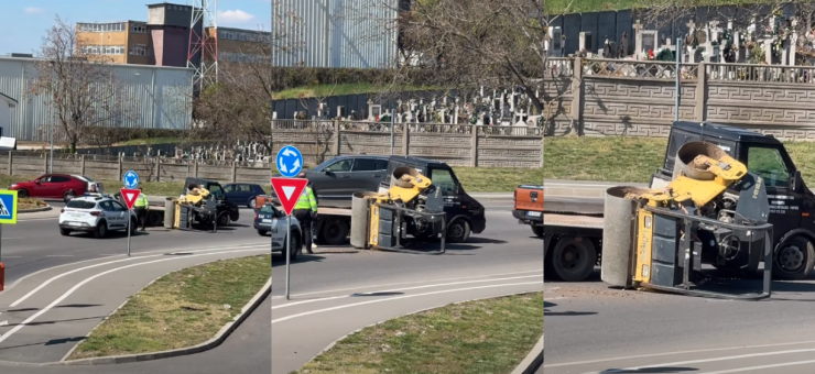 Un incident rutier neobișnuit a avut loc astăzi, vineri, 10 aprilie, în municipiul Satu Mare, în sensul giratoriu de pe drumul Botizului, la coborârea de pe Podul Transilvania, unde un utilaj de compactat pământ a căzut de pe o platformă de transport.